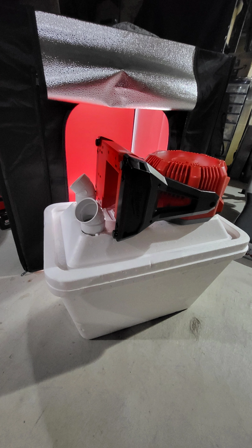 Styrofoam cooler made into air conditioner. Add ice and a fan. Used this in our tent to cool it off after really hot days. Note: Milwaukee fan is not included.