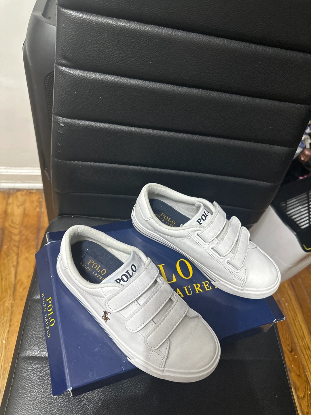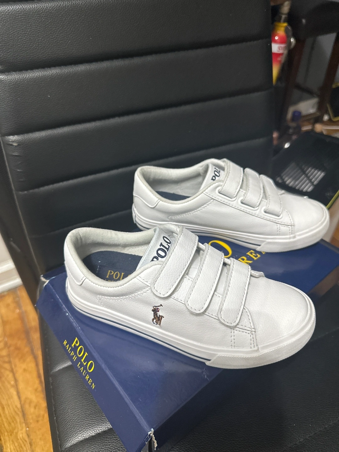 White sneakers. Velcro straps for easy closure. A great item to wear when you're out and about polo ralph Lauren sneaker for little boy size 1