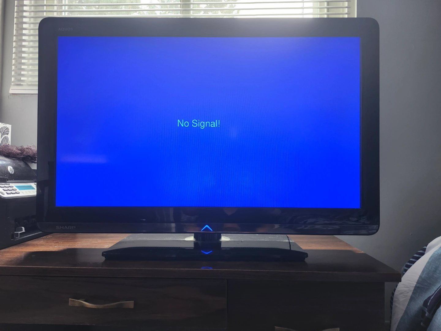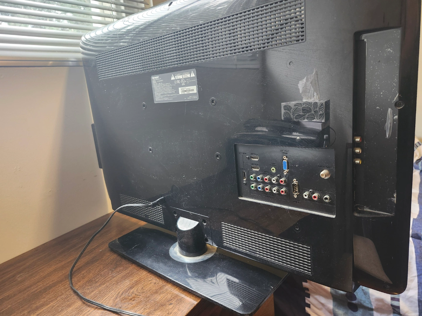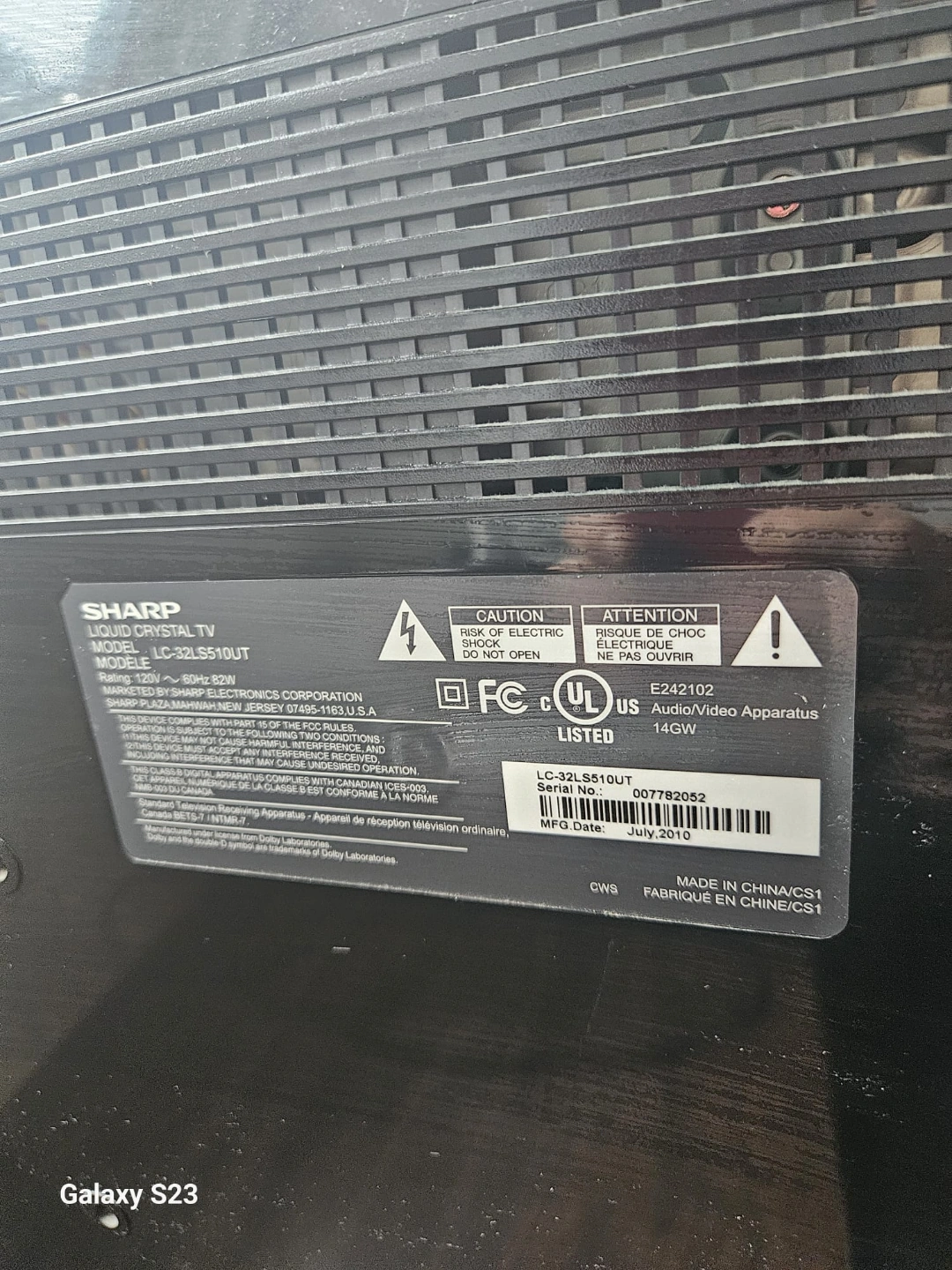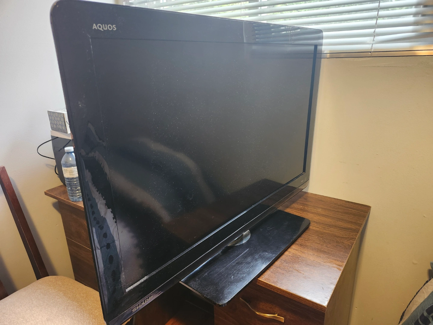 Black TV 32" with a stand. There are several ports on the back. The screen looks clean. Watching a movie on this TV will bring you such calm.