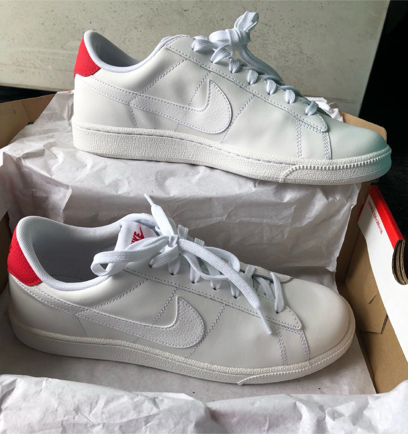 White sneakers with a textured swoosh design. Features white laces and red accents on the back. A lovely addition to your wardrobe to help you take your time, and feel at peace with your style.