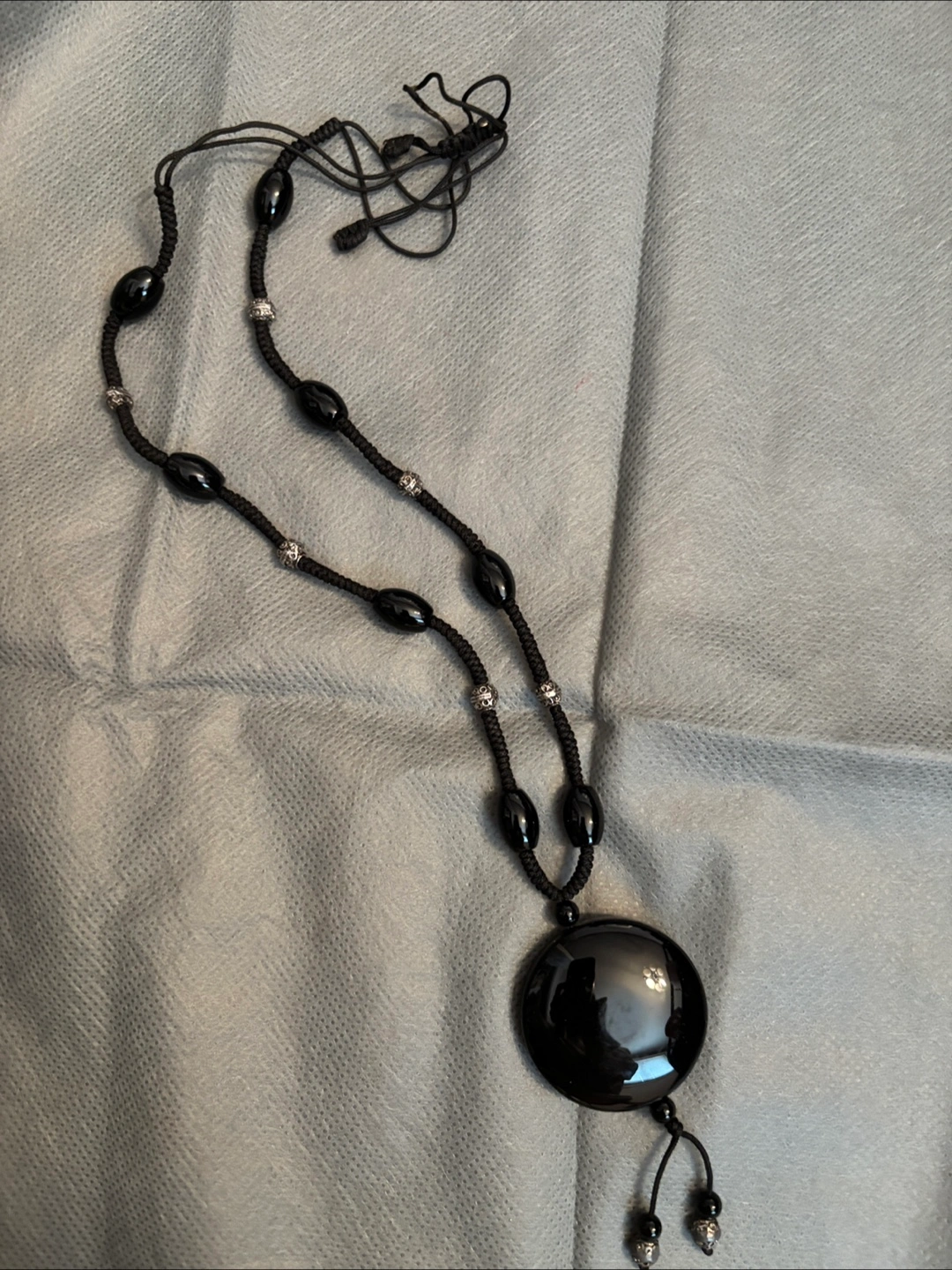 Black necklace. Features a round pendant and beaded design. Accented with shiny embellishments. Perfect for adding a touch of elegance to your everyday wardrobe.