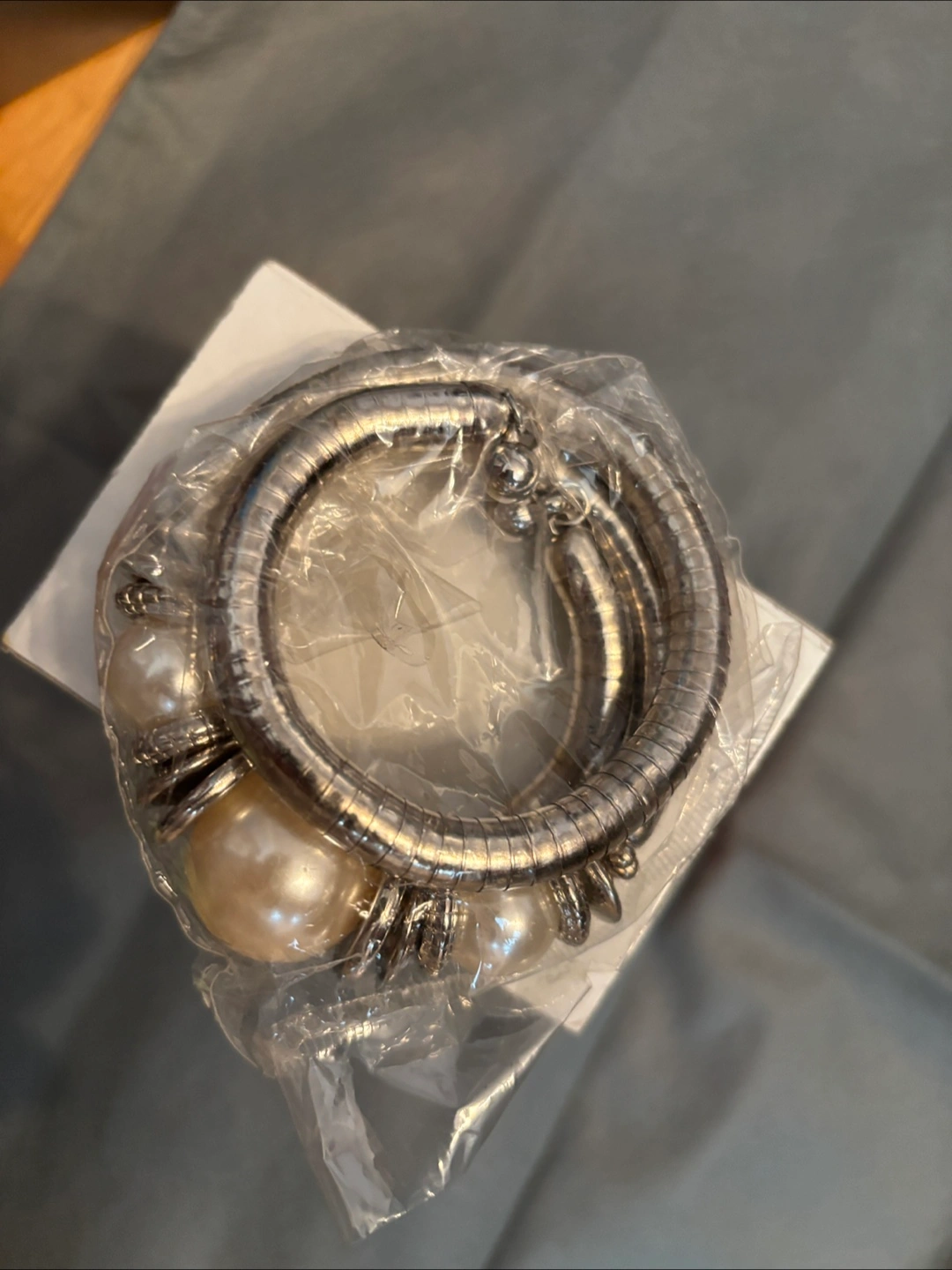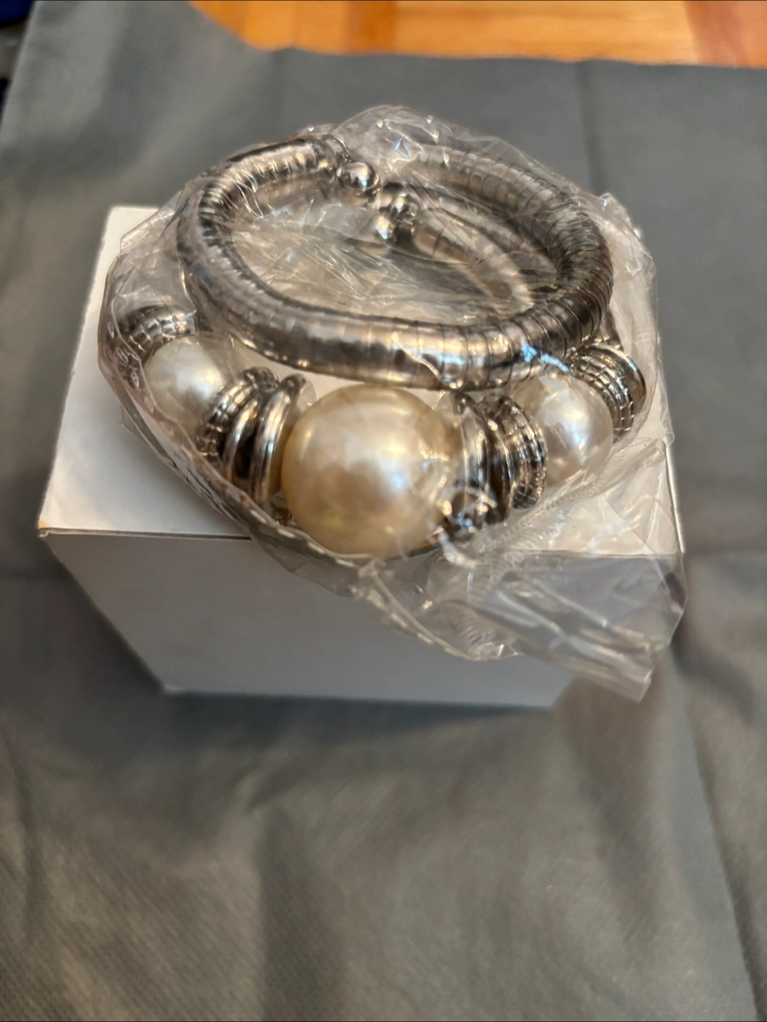 Bracelet with silver metal and pearl accents. The bracelet appears wrapped in plastic. A perfect addition to any elegant outfit, offering a sense of effortless sophistication.