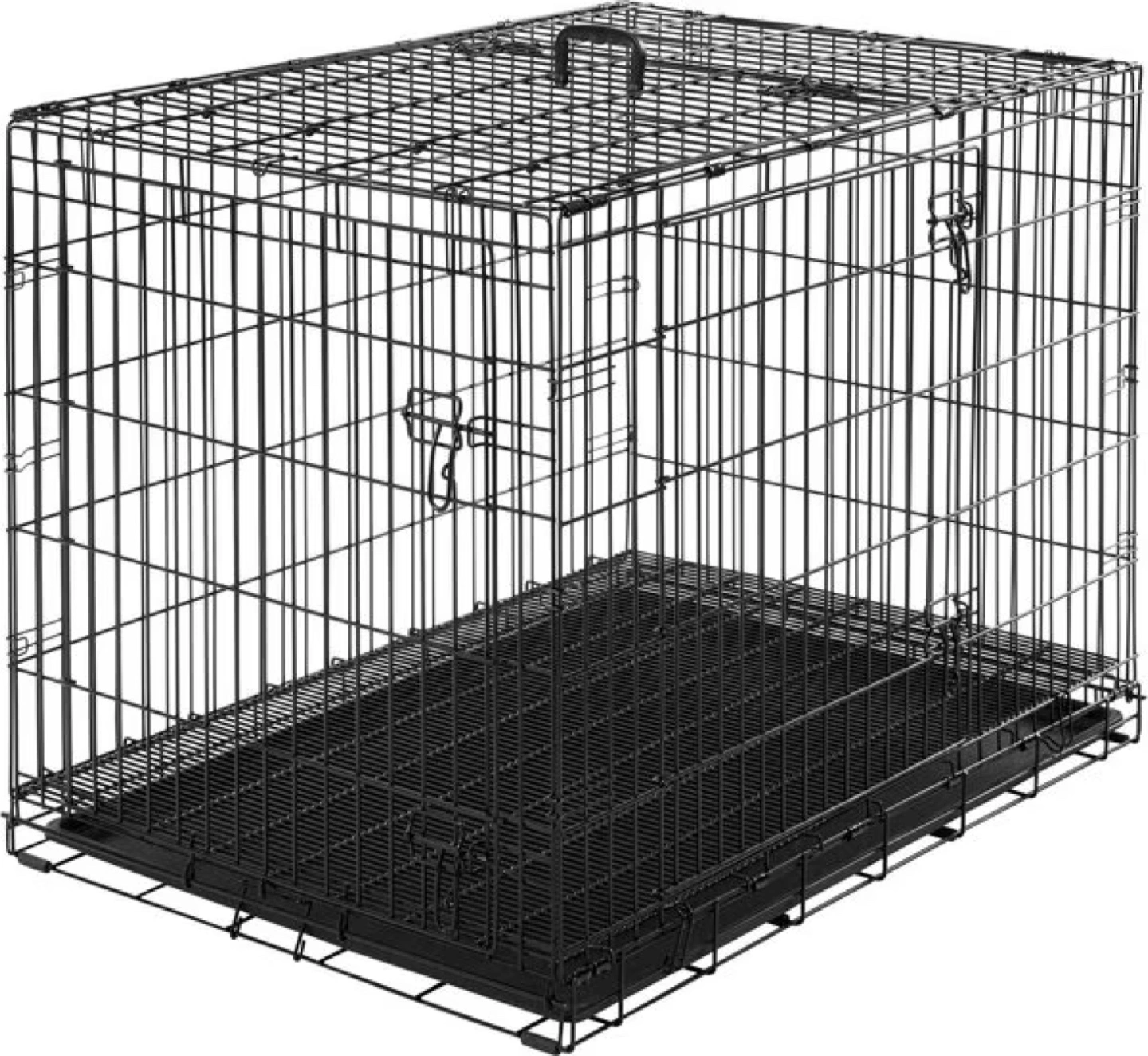 Black metal dog crate. Featuring multiple doors. Equipped with a removable tray. A great place for your furry friend to feel safe and relaxed. Suitable for large dogs. 37-in L x 25-in W x 27-in H. Sells for $120 new