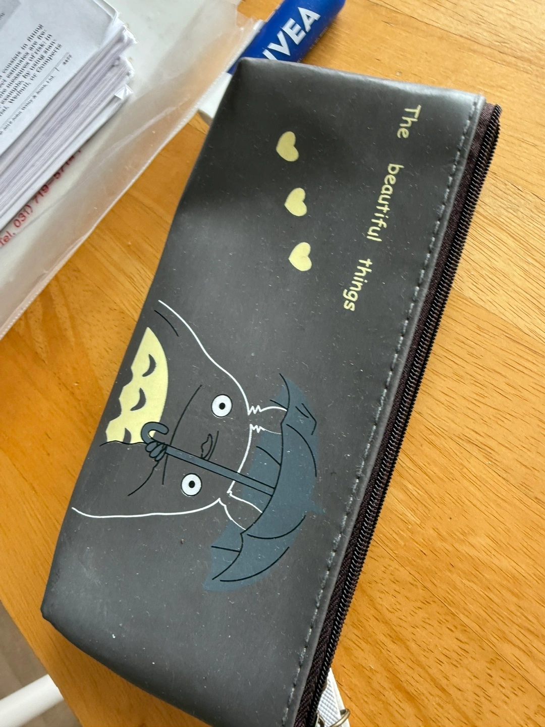 Gray pencil case. Features the Totoro character. The words 'The beautiful things' are also visible on the case. A perfect place to store all of your pens and pencils for a productive day.