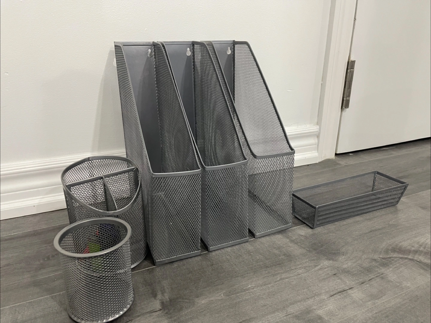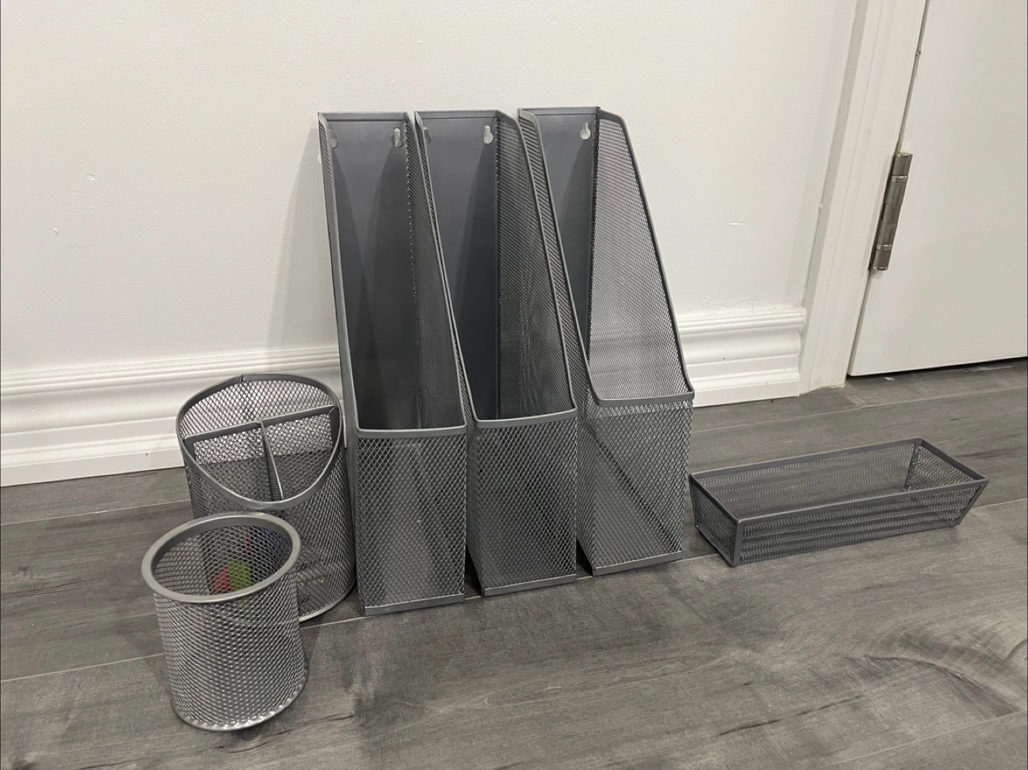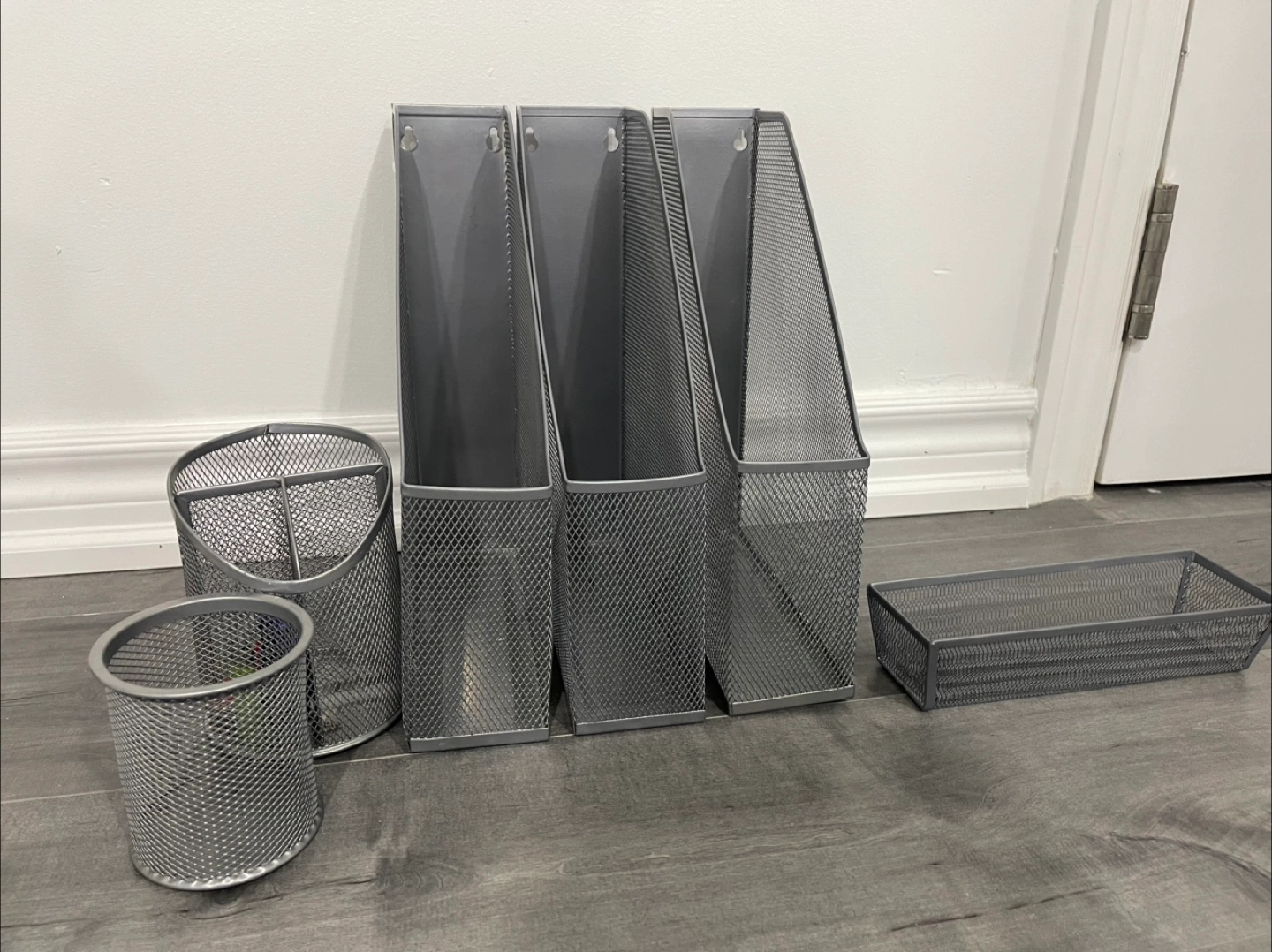 10Organizers including pencil and folder/notebook holders. They are constructed with a mesh design. These organizers will allow you to nicely organize your office with a nice asthetic.