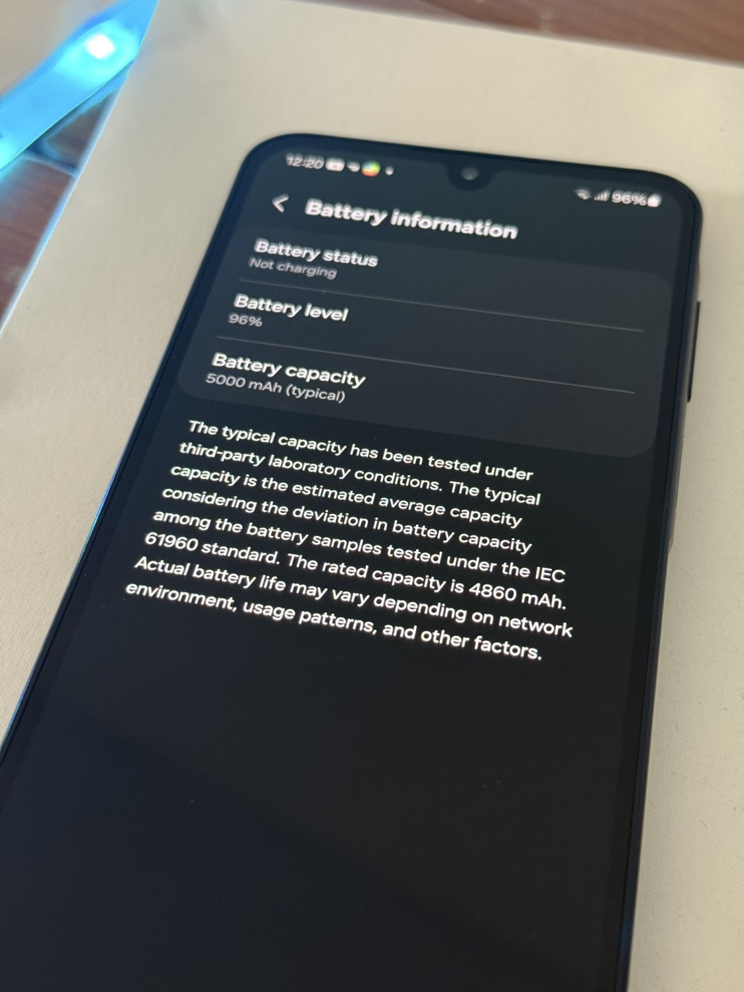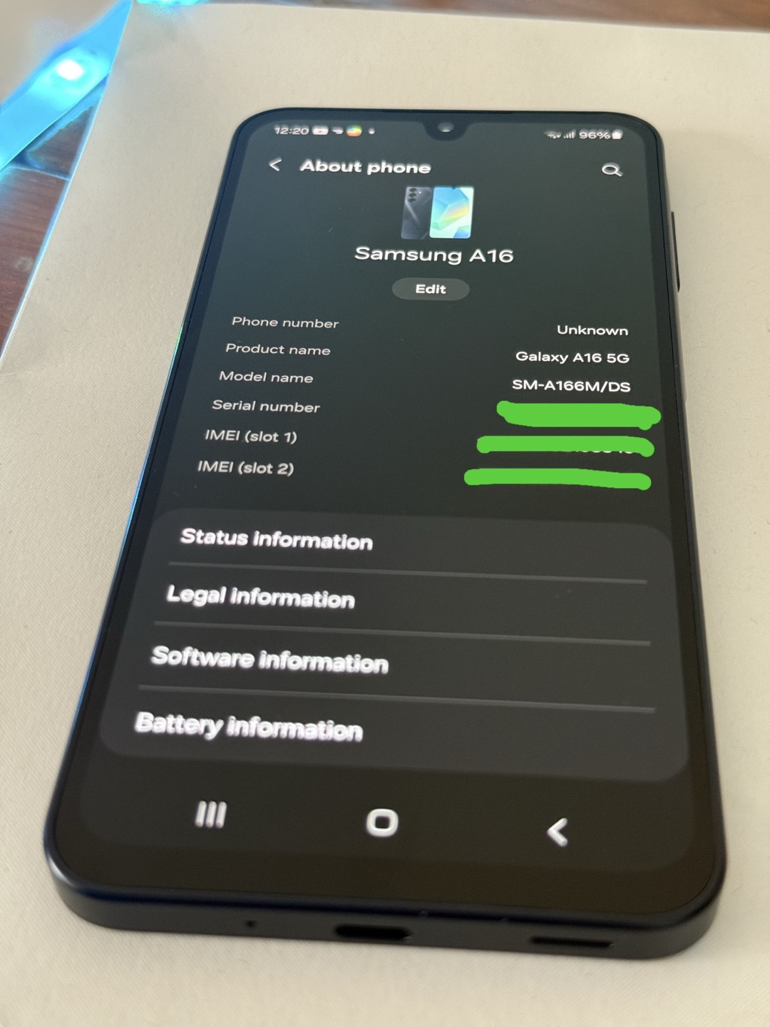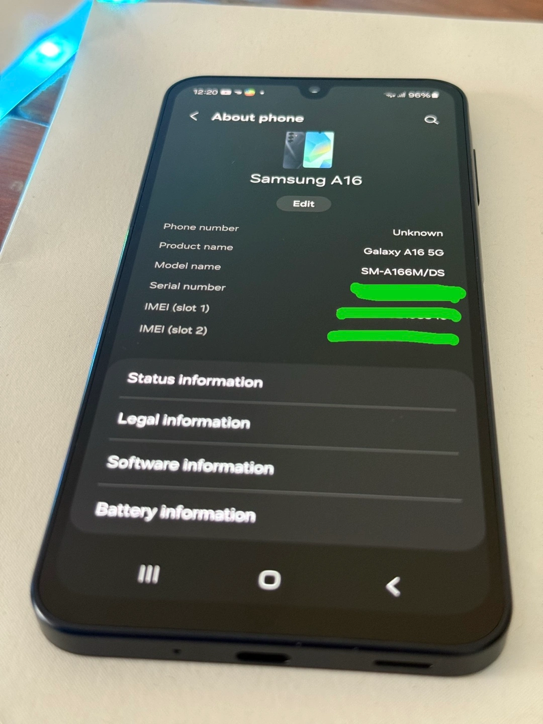 Android Samsung A16 5G smartphone. 6.7 inches screen. Ultra Wide Camera lens. Phone is only 7.9 inches thick. Samsung brand's logo on the back. High speed super fast 5G connectivity and 2.4 Ghz CPU speed using Octa-Core. Super Fast Charging. Battery 96%. Storage 128 GB. Dual Sim.