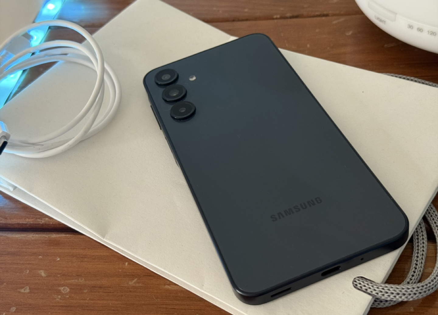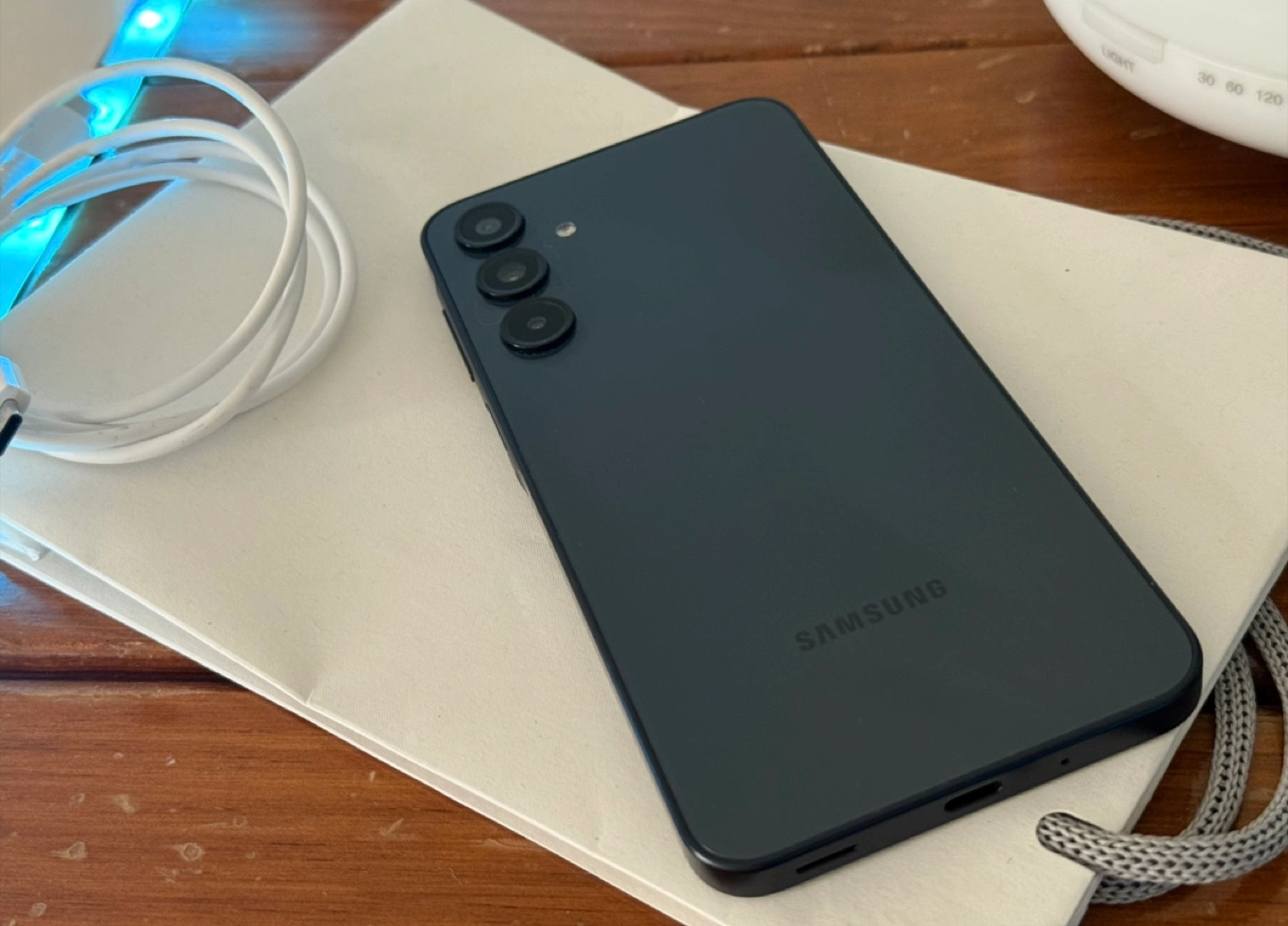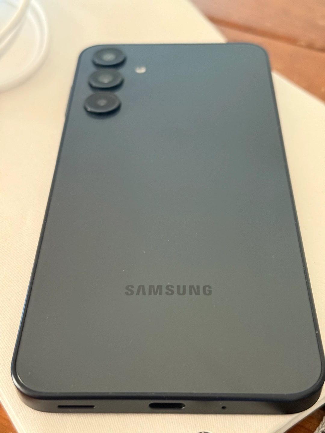 Android Samsung A16 5G smartphone. 6.7 inches screen. Ultra Wide Camera lens. Phone is only 7.9 inches thick. Samsung brand's logo on the back. High speed super fast 5G connectivity and 2.4 Ghz CPU speed using Octa-Core. Super Fast Charging. Battery 96%. Storage 128 GB. Dual Sim.