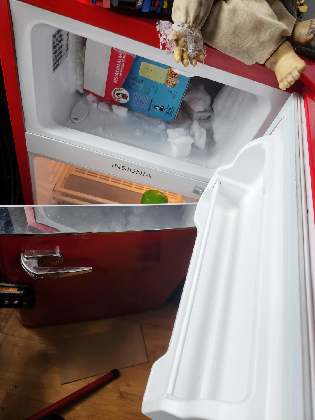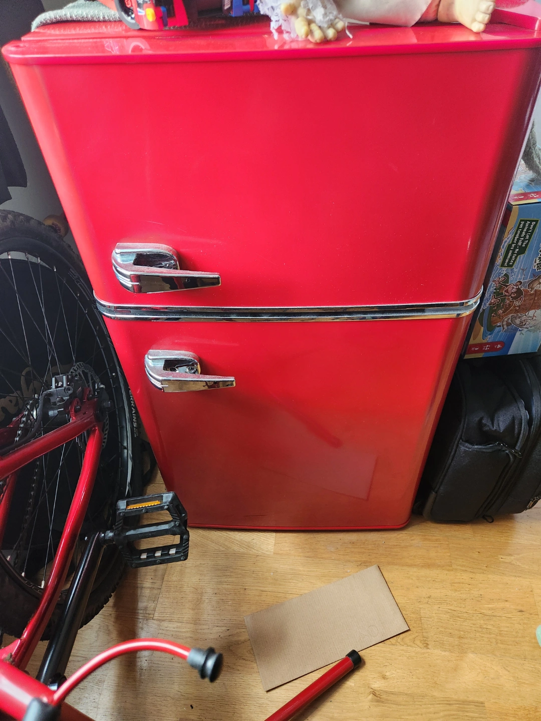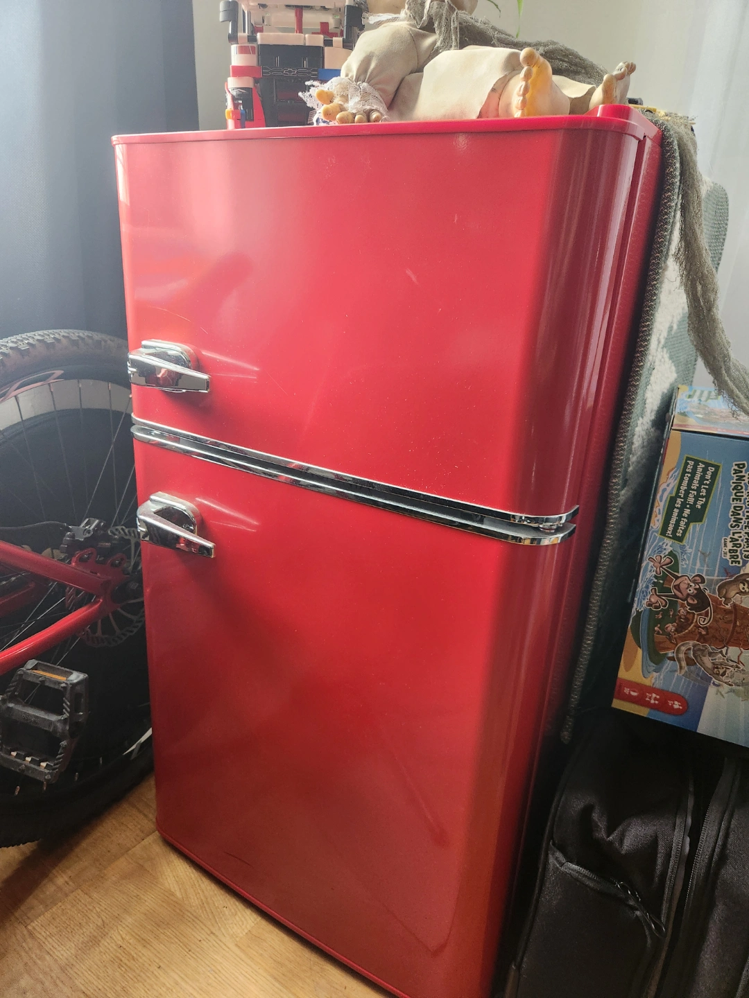 A red mini refrigerator. Features a top freezer compartment and a lower refrigerated compartment. Chrome handles. Great for keeping drinks cold for those warm afternoons.