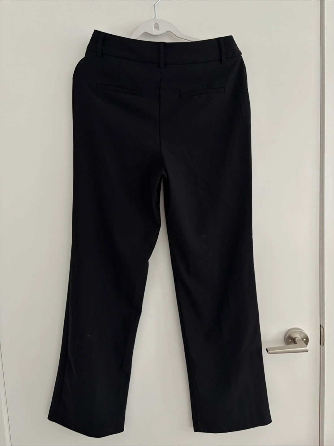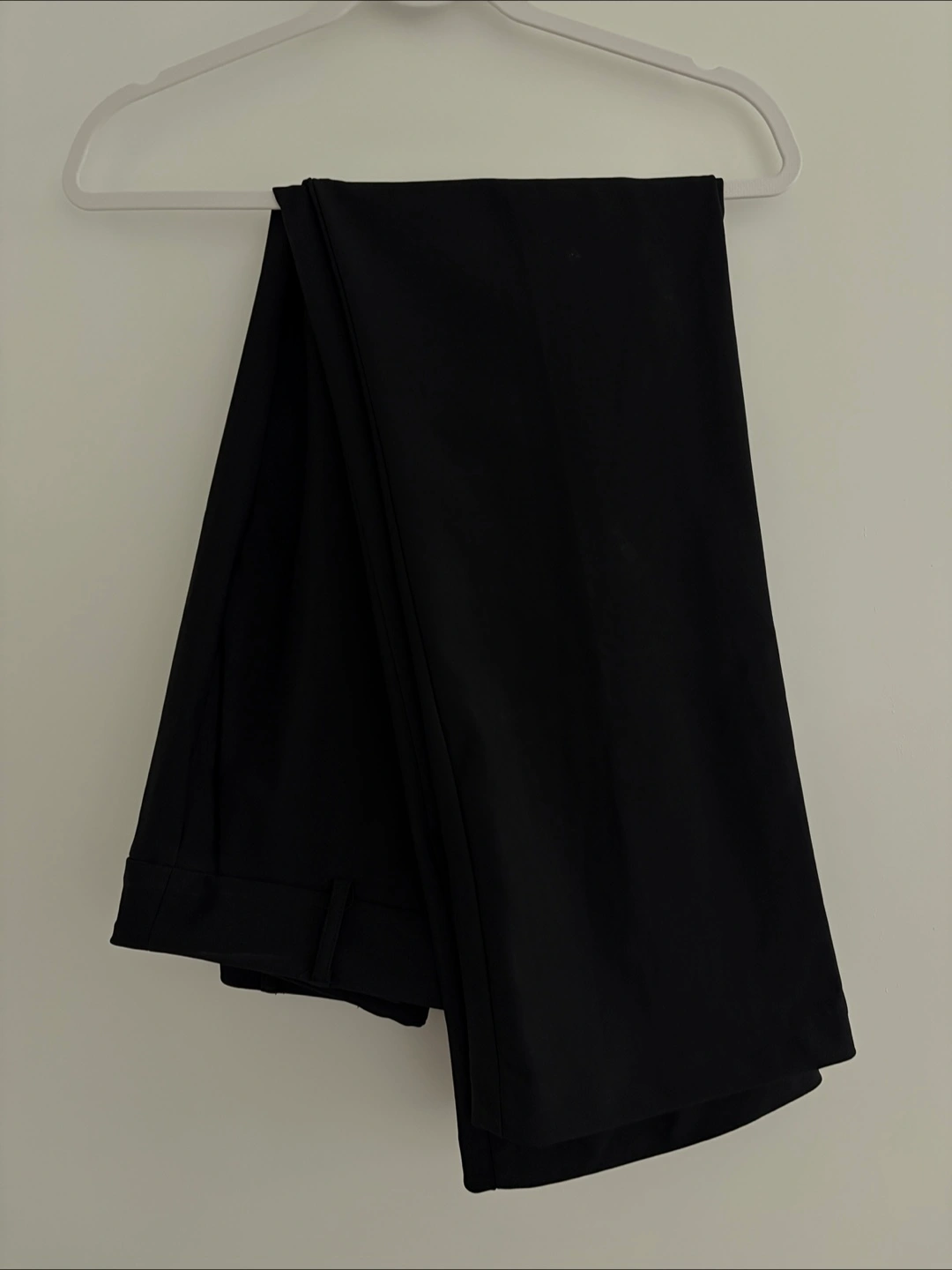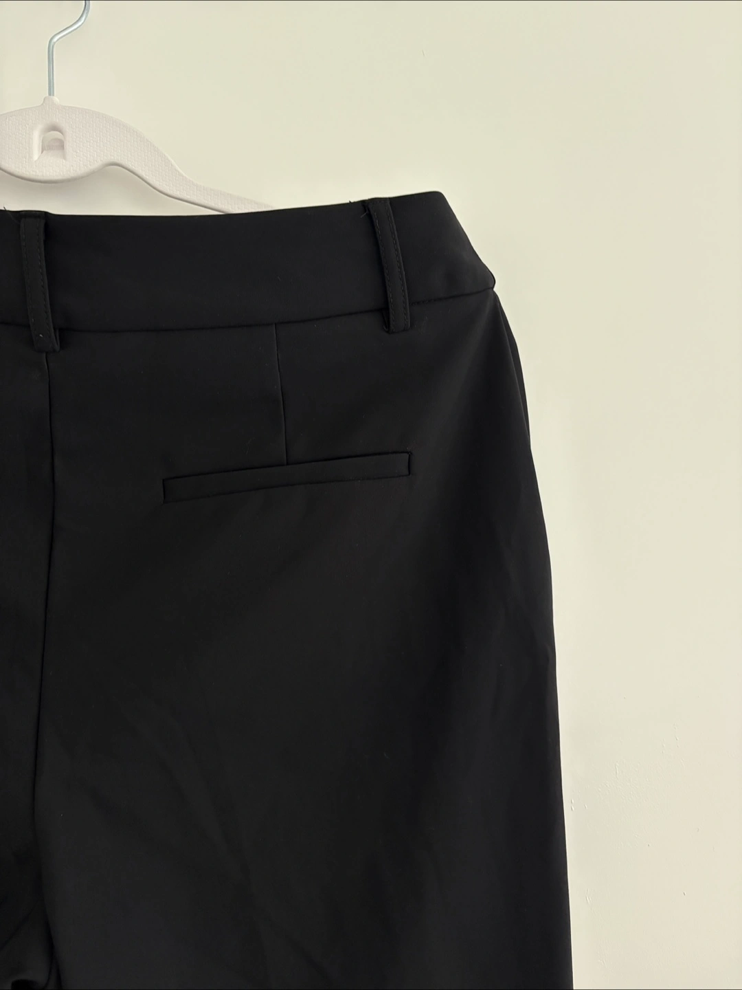 Dark, solid colour pants. Features two front pockets and two back pockets. Front zipper and button closure. An excellent choice for work.