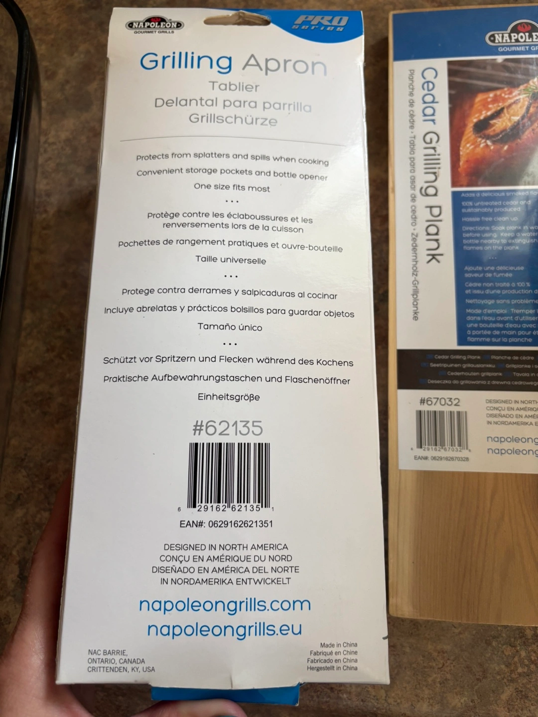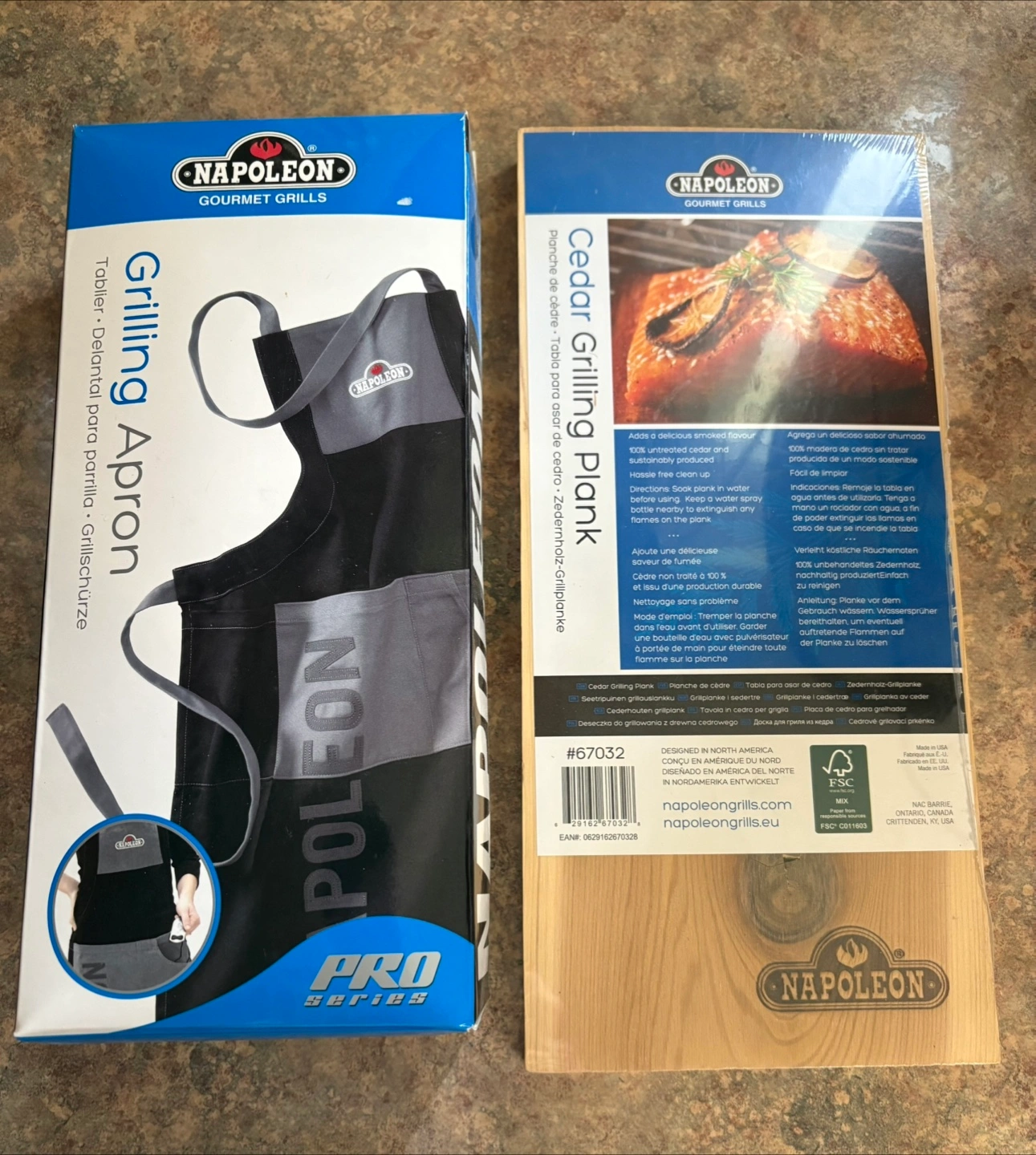 26BOTH NEW IN BOX/PACKAGING GREAT GIFT FOR FATHERS DAY!! Grilling Apron & Cedar Grilling Plank Apron sells for $45 or more - plank $13 plus taxes ASKING $25 FIRM