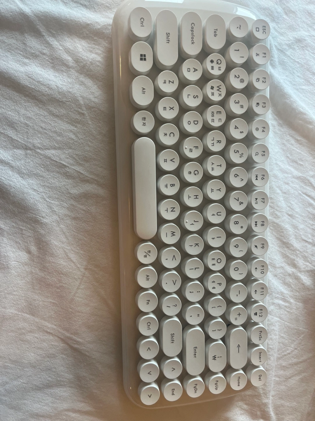 Features rounded keys. Keyboard shows English and Korean characters. Place on your desk and let your fingers dance across the keys.