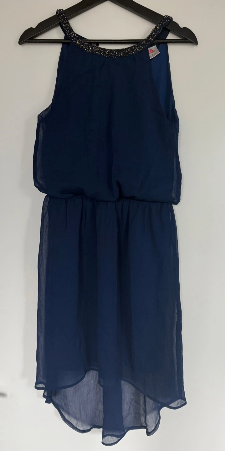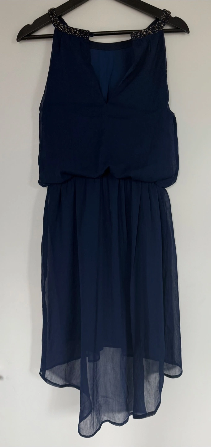 A sleeveless dress. It is dark navy blue. There is a beaded collar detail.
