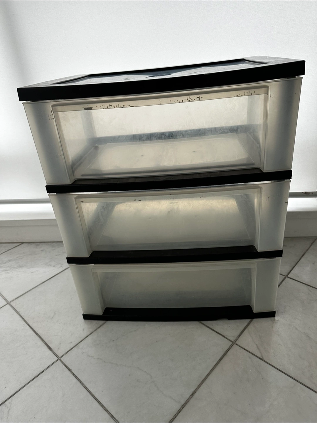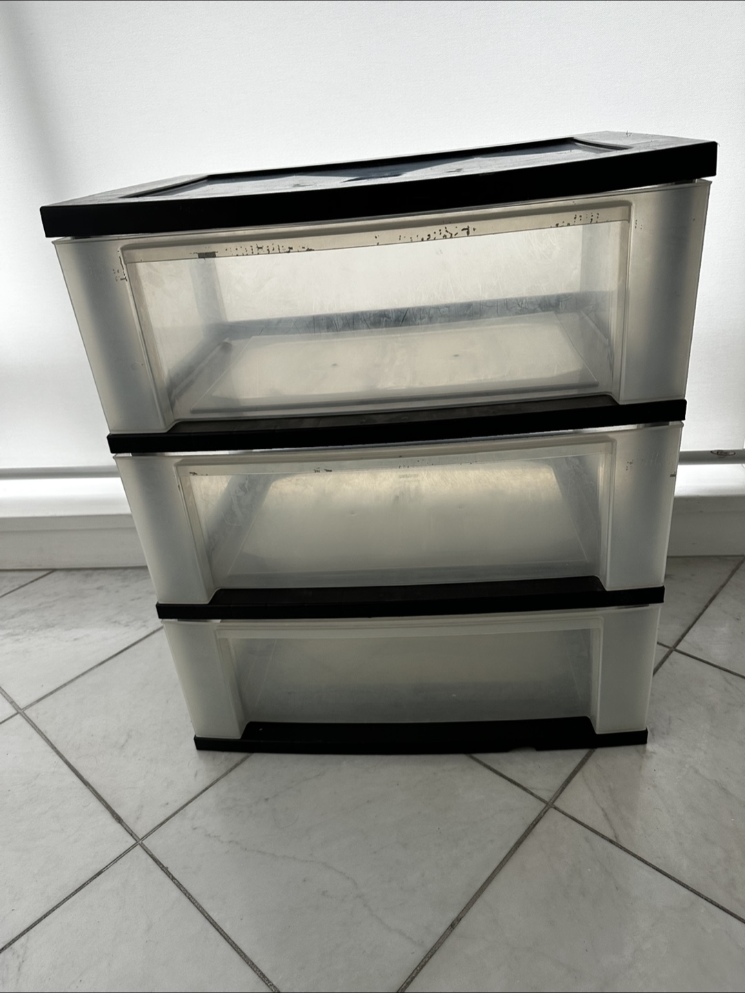 A stackable storage unit. Featuring three drawers. Each drawer is translucent with black trim. This unit is an easy way to get organized.