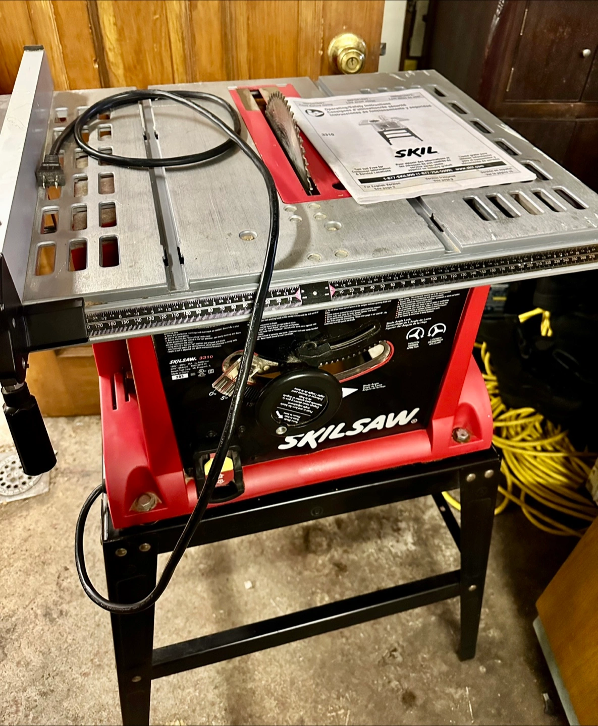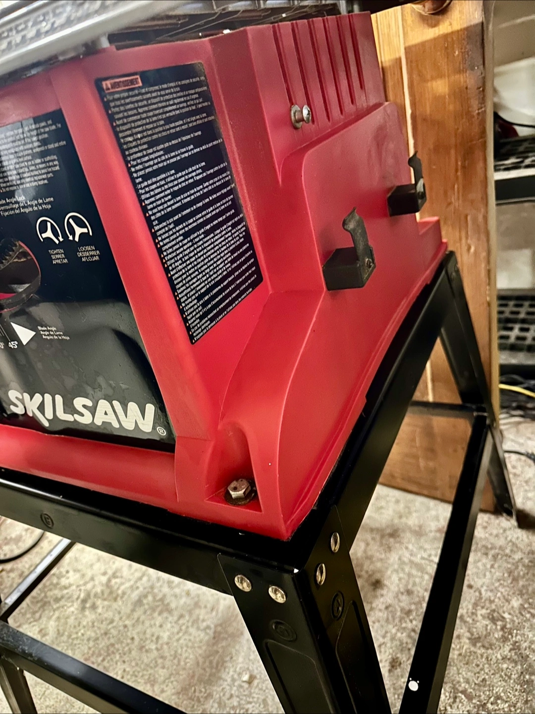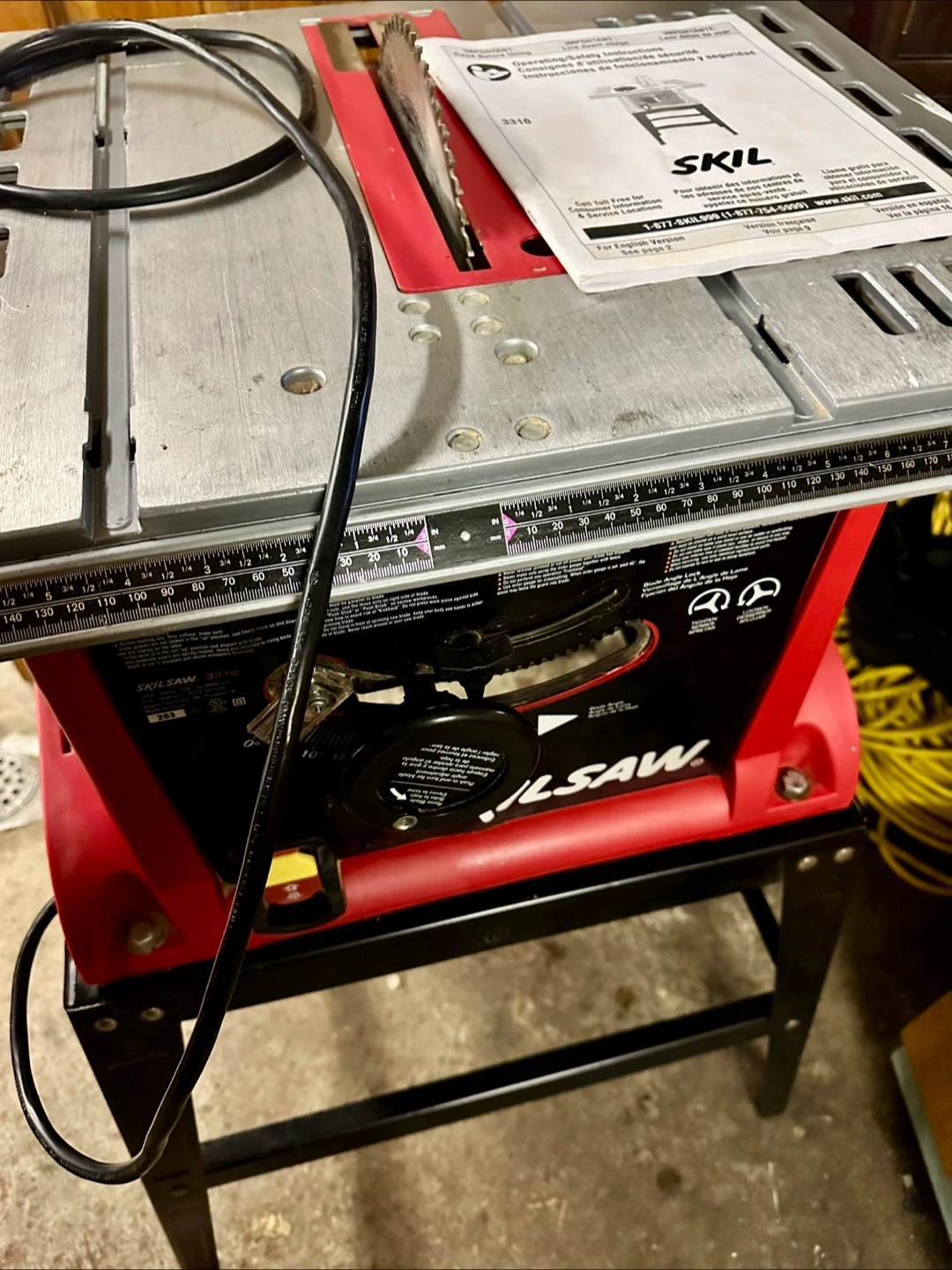 Red and black table Skilsaw on a black stand. Features a silver table surface. Comes with a manual, and a power cable. Used only a few times; selling because it’s just taking up space.