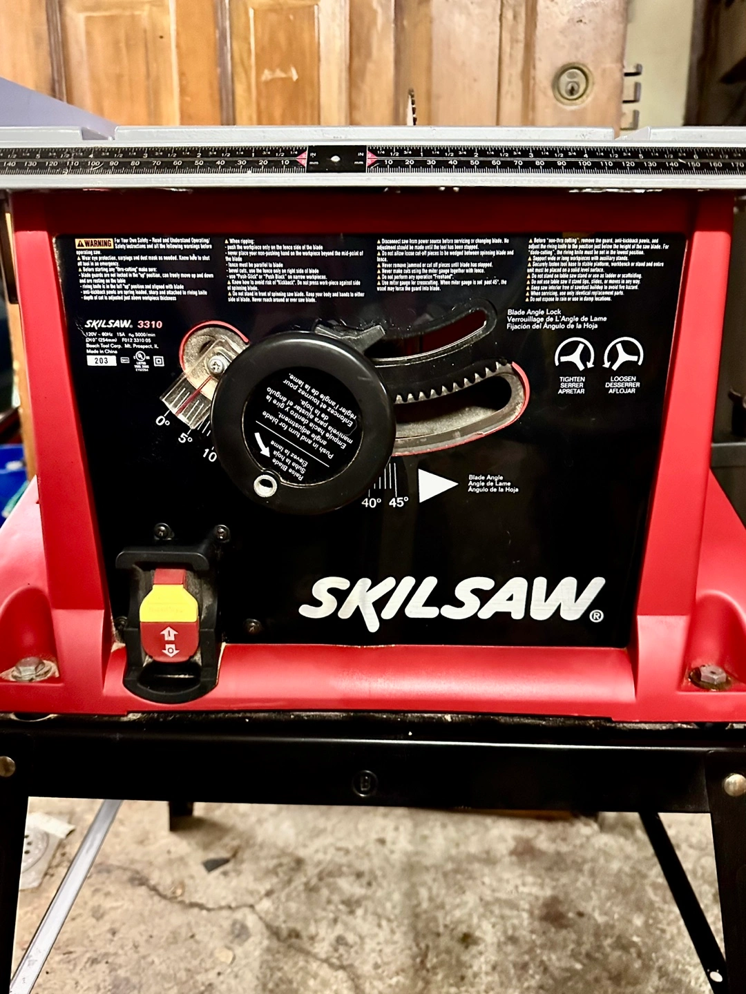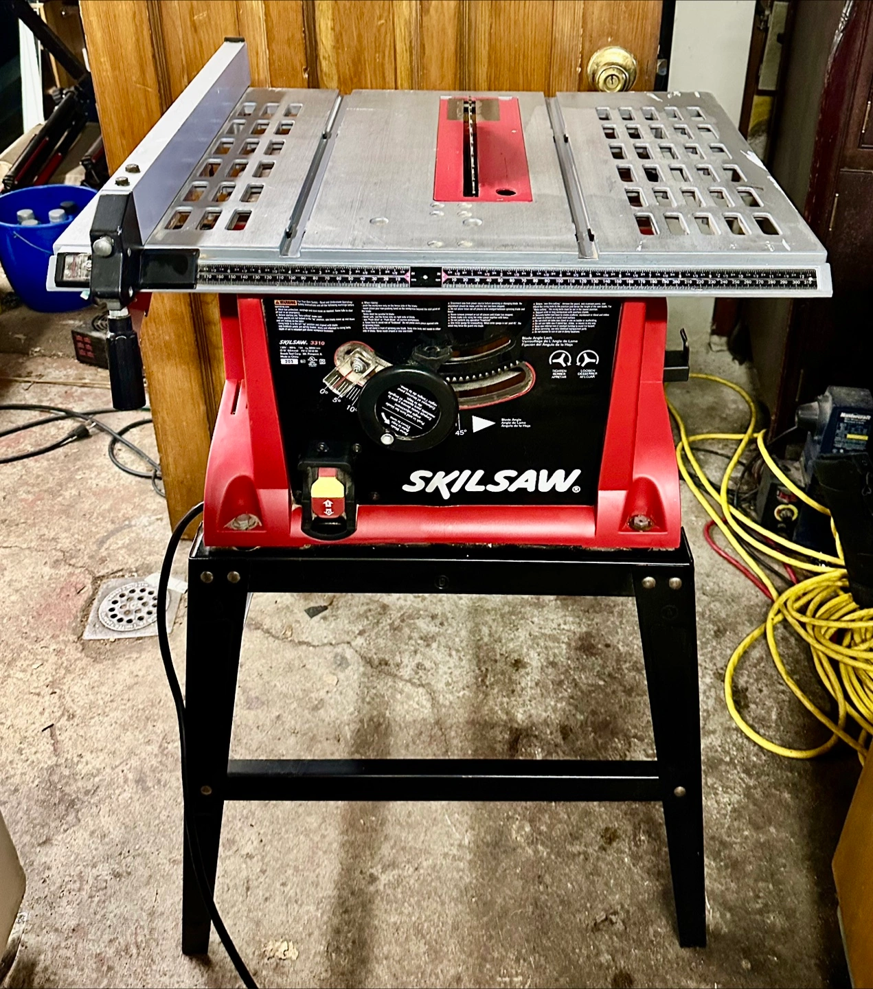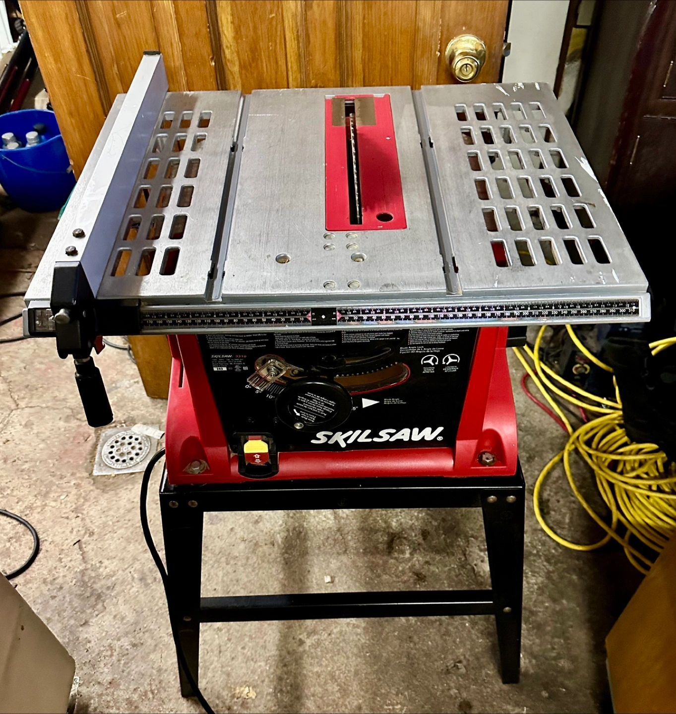 Red and black table Skilsaw on a black stand. Features a silver table surface. Comes with a manual, and a power cable. Used only a few times; selling because it’s just taking up space.