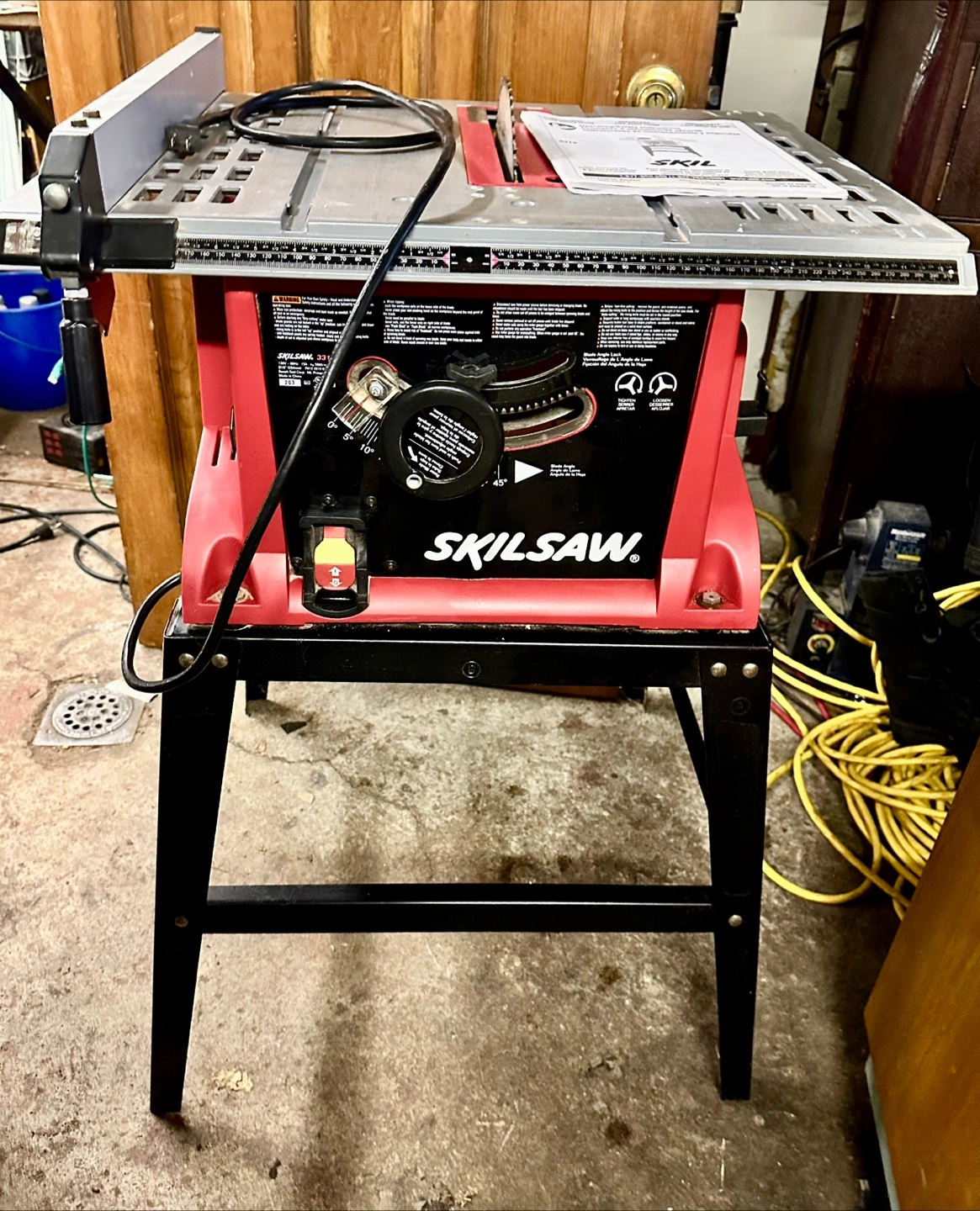Red and black table Skilsaw on a black stand. Features a silver table surface. Comes with a manual, and a power cable. Used only a few times; selling because it’s just taking up space.