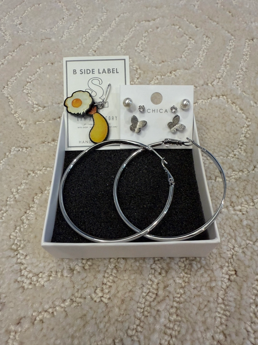 New earrings from Japan and Korea! Includes a set of sterling silver hoops, cute gudetama themed earrings and assorted studs.