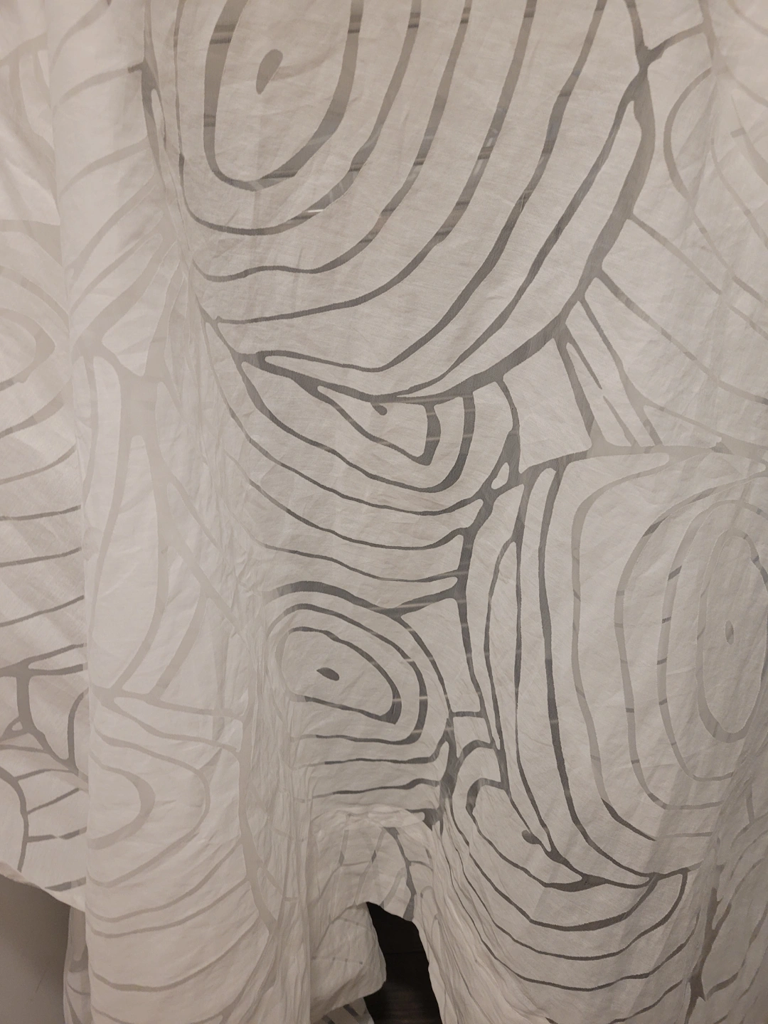 White fabric. Decorated with a circular pattern of grey lines. It is sheer. This textile could be used for a lovely, airy curtain to brighten a room.