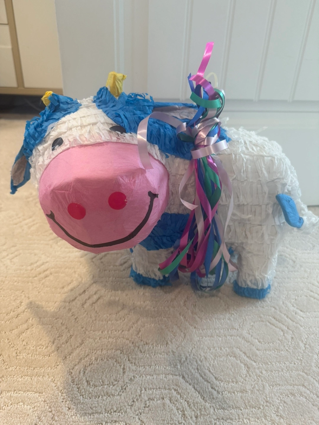 Cow shaped pinata. Made with blue and white tissue paper and has colourful ribbons where the handle is. Great for birthday parties !
