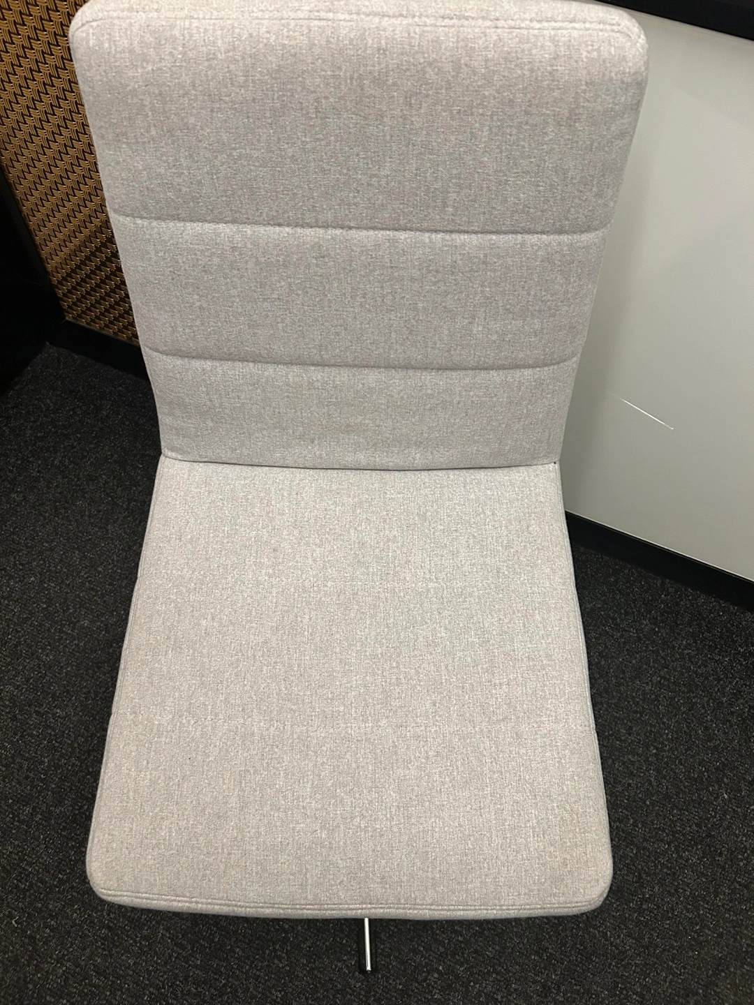 Chair with a grey fabric seat and backrest. Features a wooden-like trim on the chair's frame. Has a chrome-coloured swivel base. You can enjoy sitting on this chair while reading a good book.