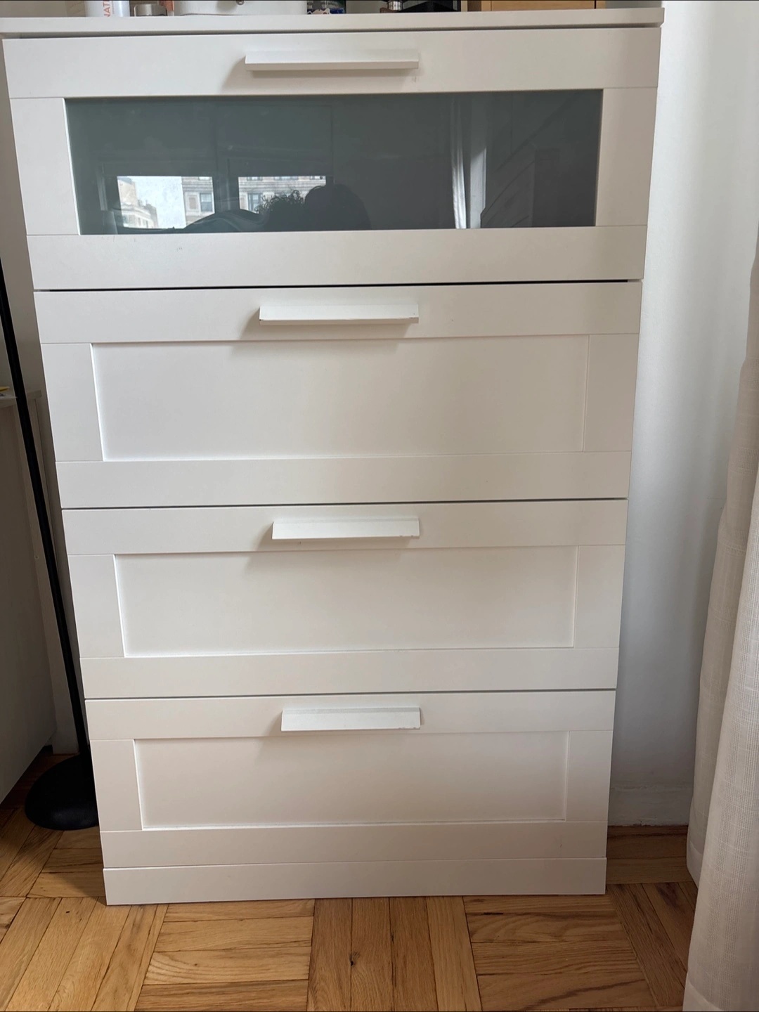 A white chest with multiple drawers. The top drawer is clear, while the others are solid. A good place to keep your items in an organized way.