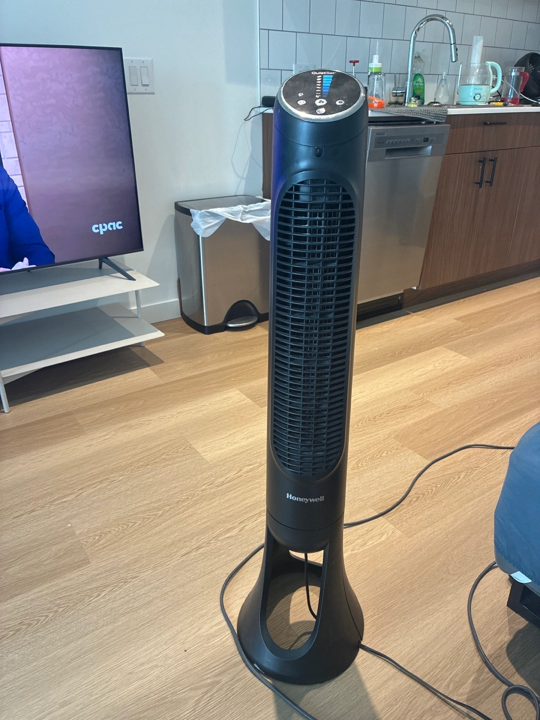 Tower fan with a digital display and multiple settings. Features several speeds. You could place this fan in your bedroom for a comfortable night's sleep.