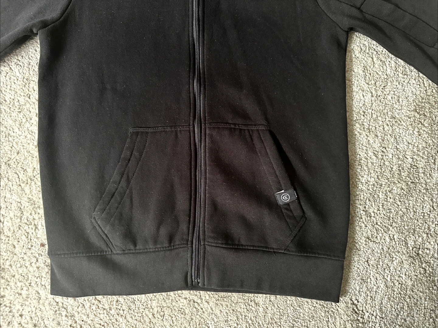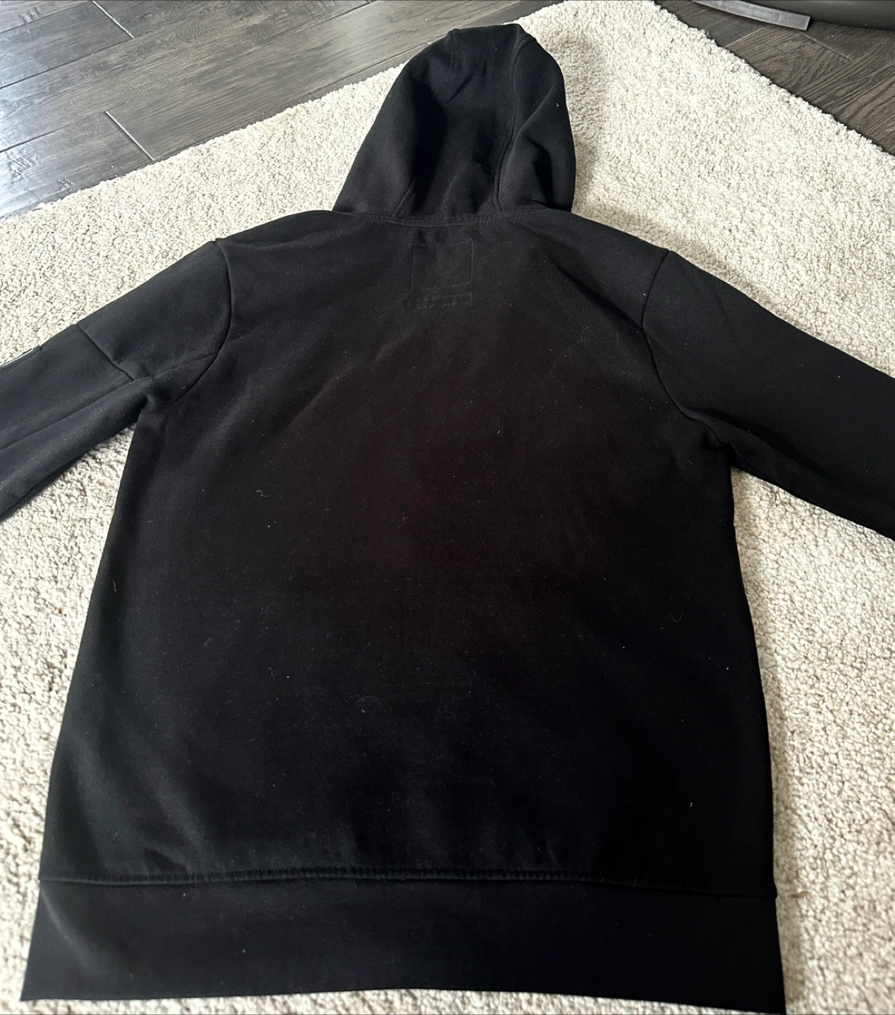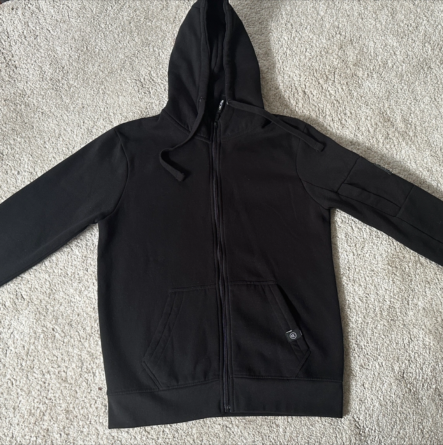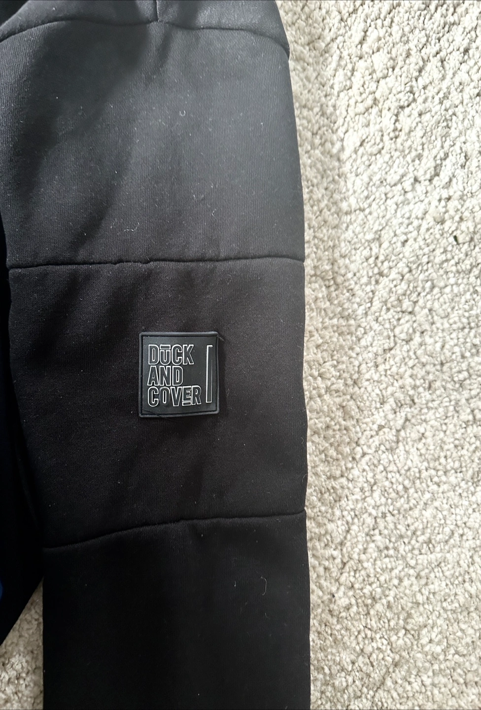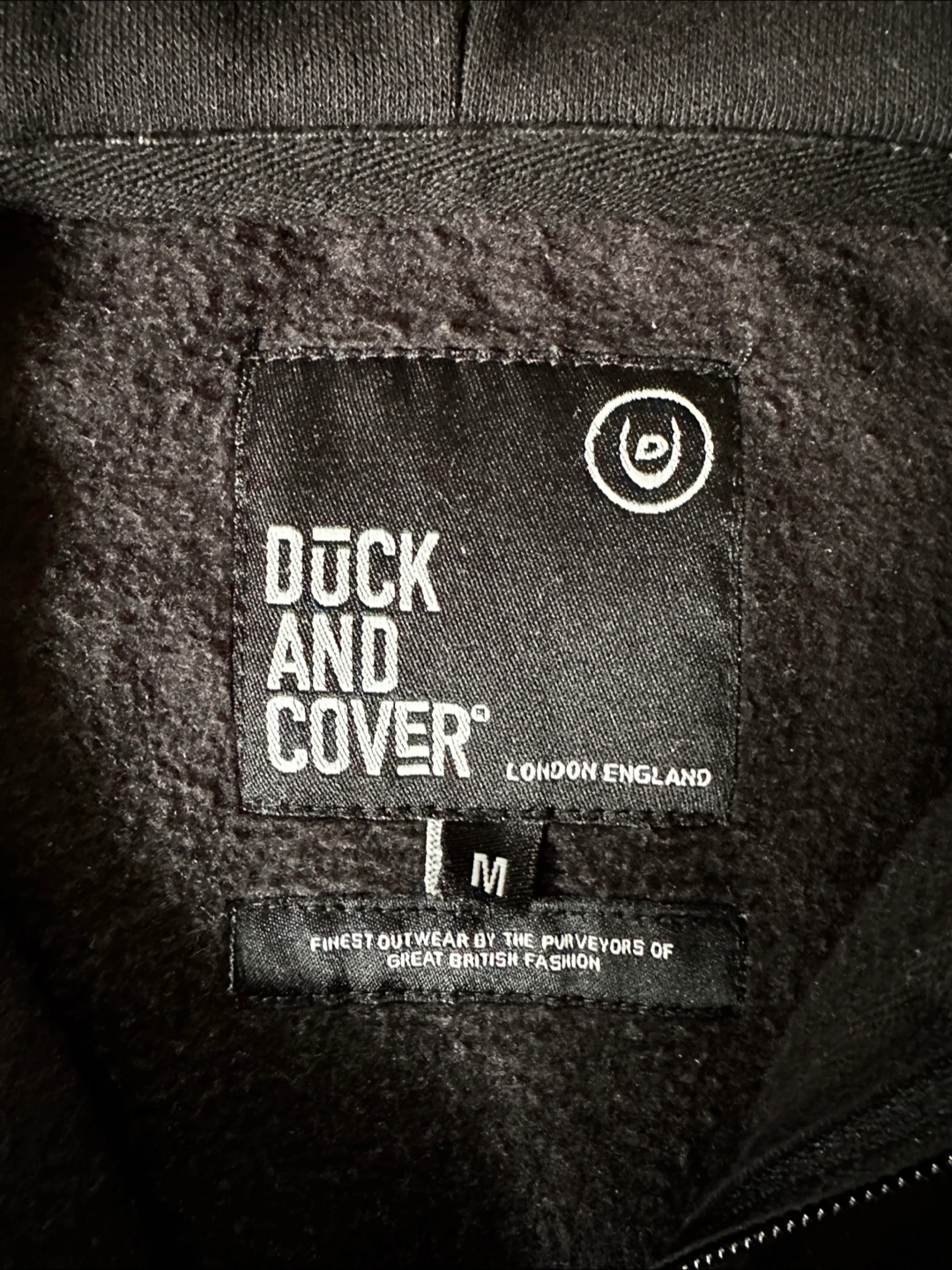 292Black hoodie with a zipper. Features a hood and two pockets. Has a patch on the sleeve. Consider relaxing while wearing this cozy hoodie. Size medium - in great condition, only worn a few times- purchased in the UK Brand : Duck & Cover $15 Fastest pick up in East York - Greenwood/Mortimer