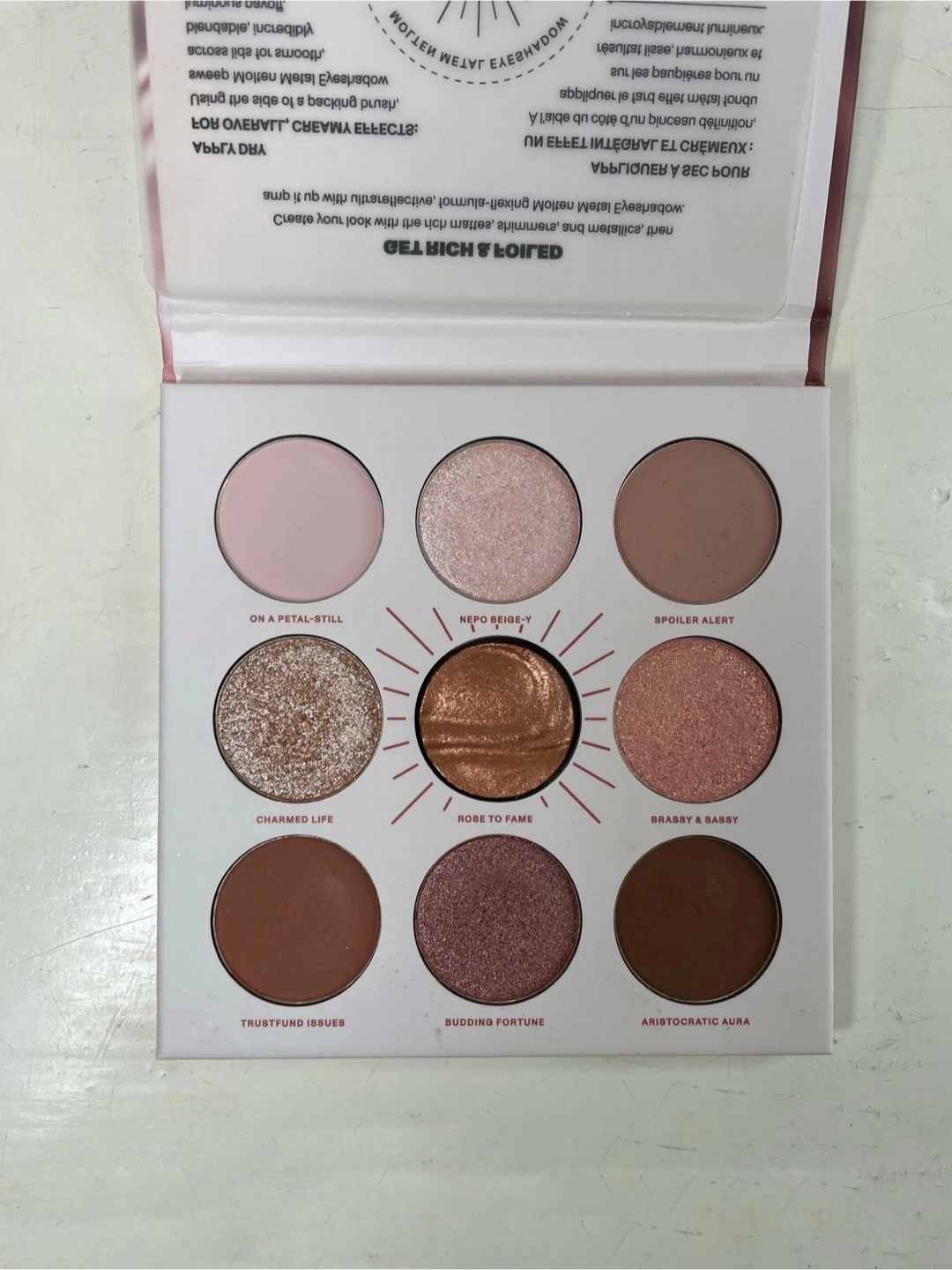 Morphe palette with multiple eyeshadow shades. Lot of beautiful pinks, coppers & rose golds. Used a couple of times, just doesn’t suit my skin tone.