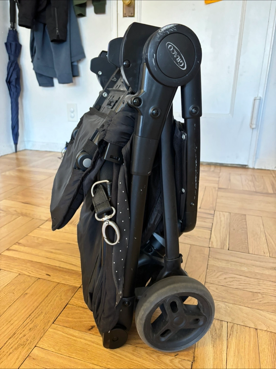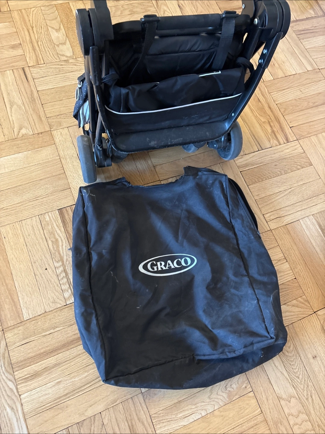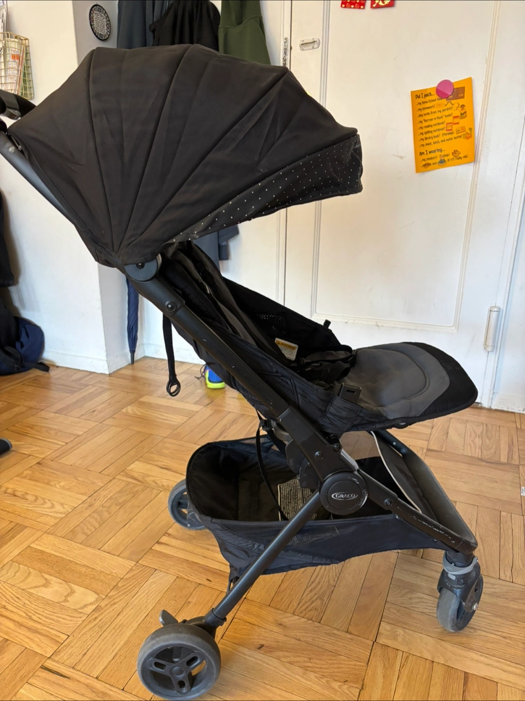 Black stroller. Canopy. Features a storage basket. The stroller folds up. A great way to get out and about.