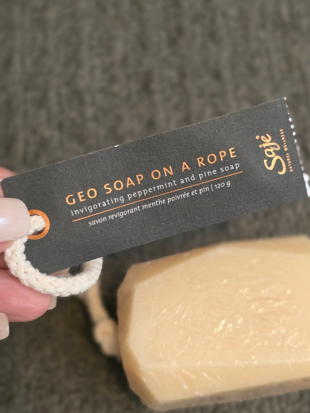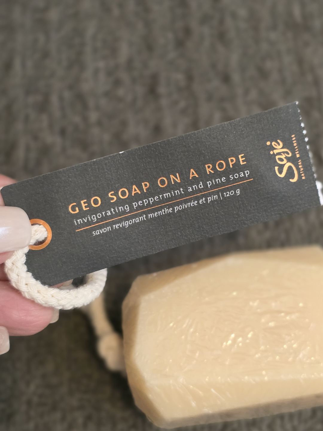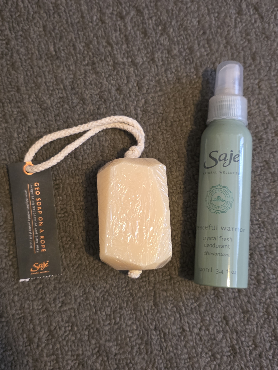 Saje bundle with Peaceful Warrior crystal fresh deodorant, and a GEO soap on a rope.