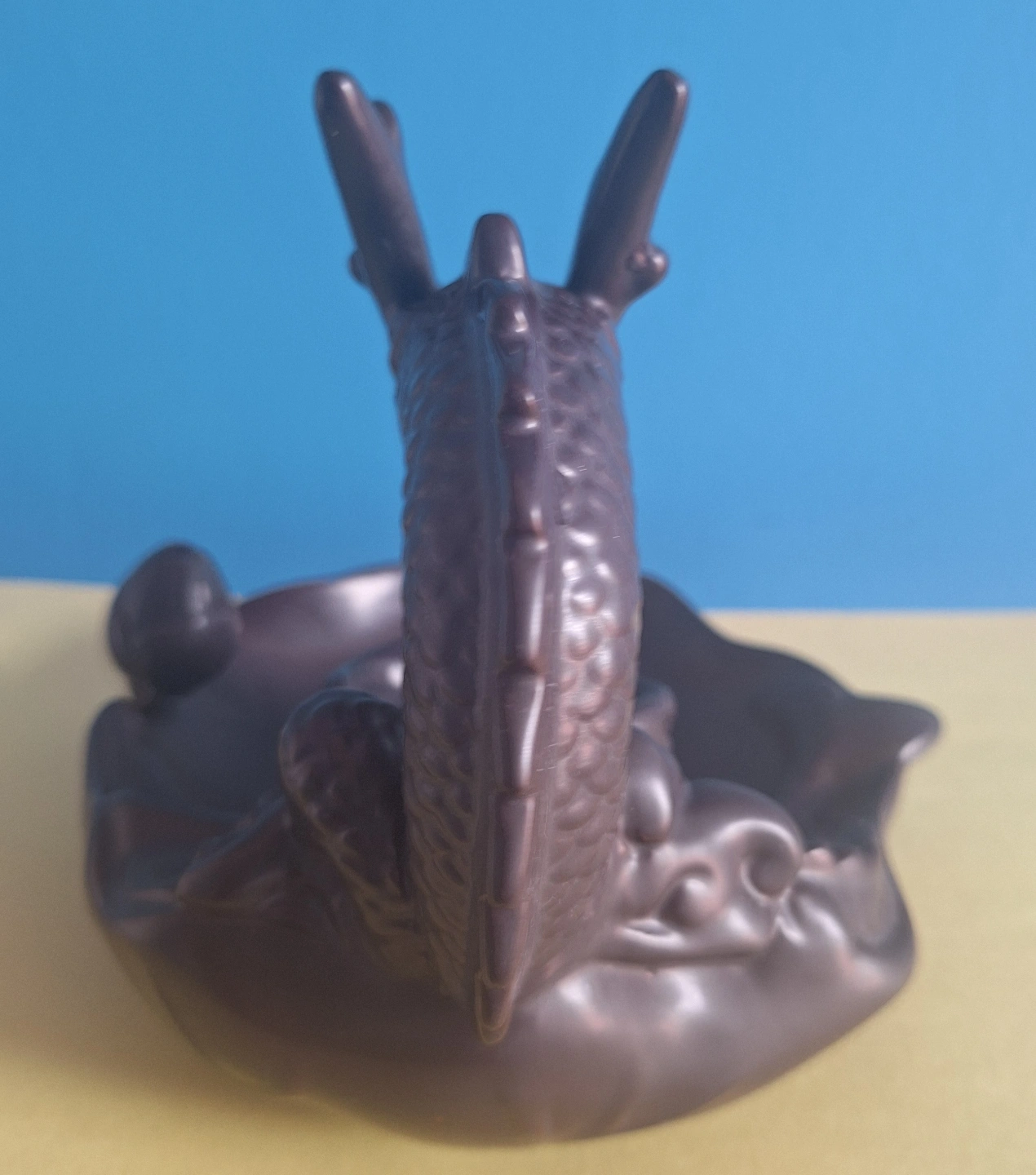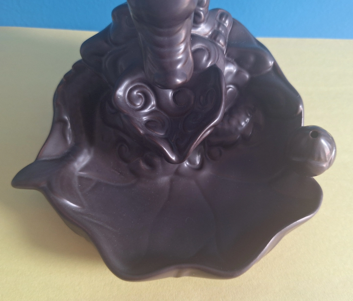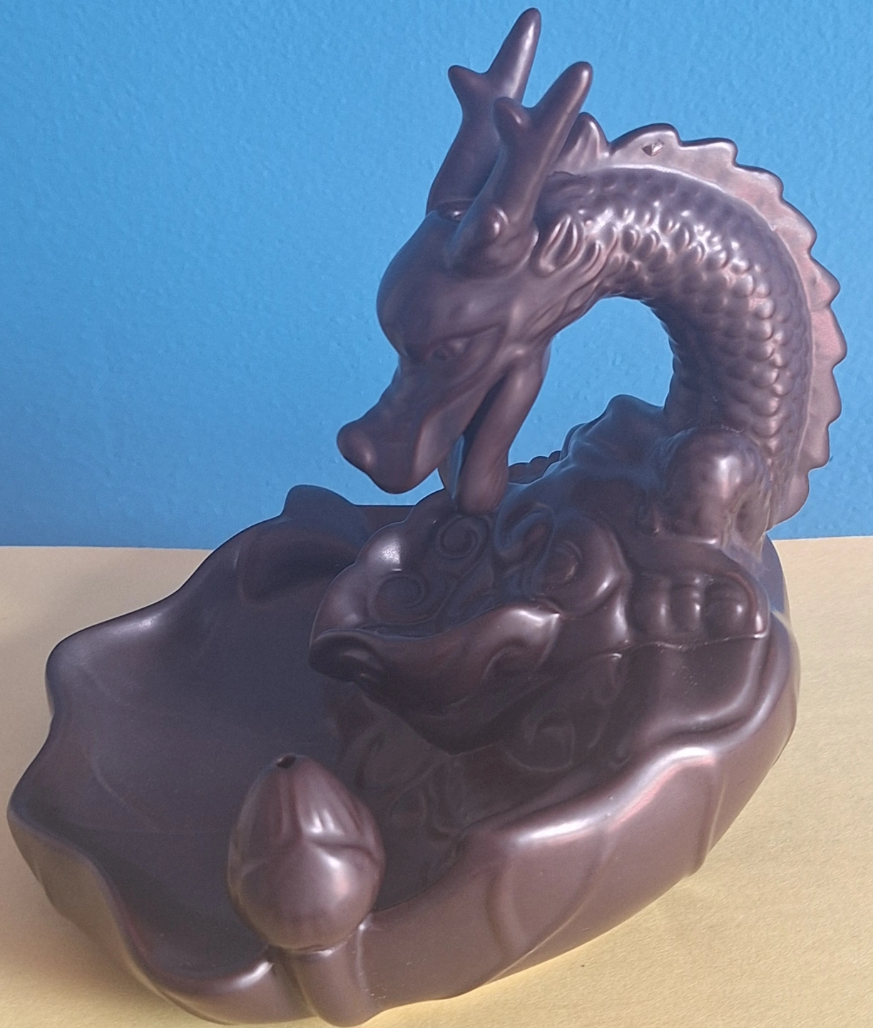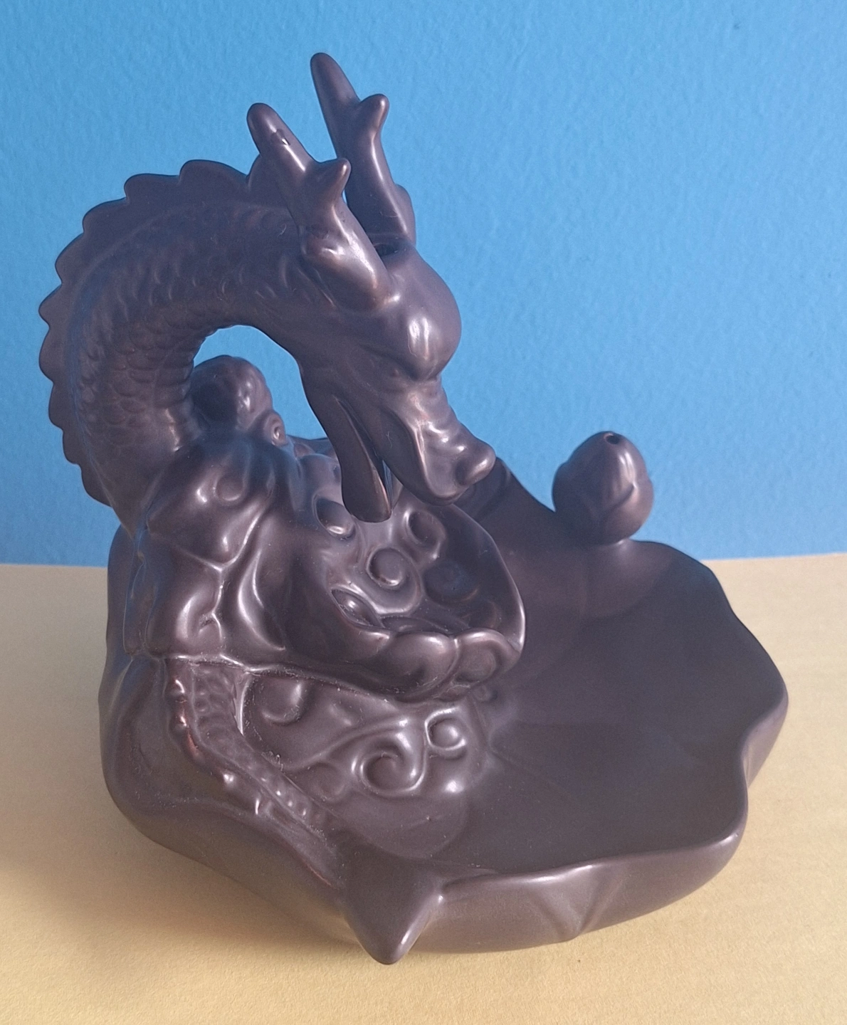Intricately detailed dragon design. A ceramic incense burner. Features a tray and sphere. Could be used to create a calming atmosphere and be just a nice decoration.