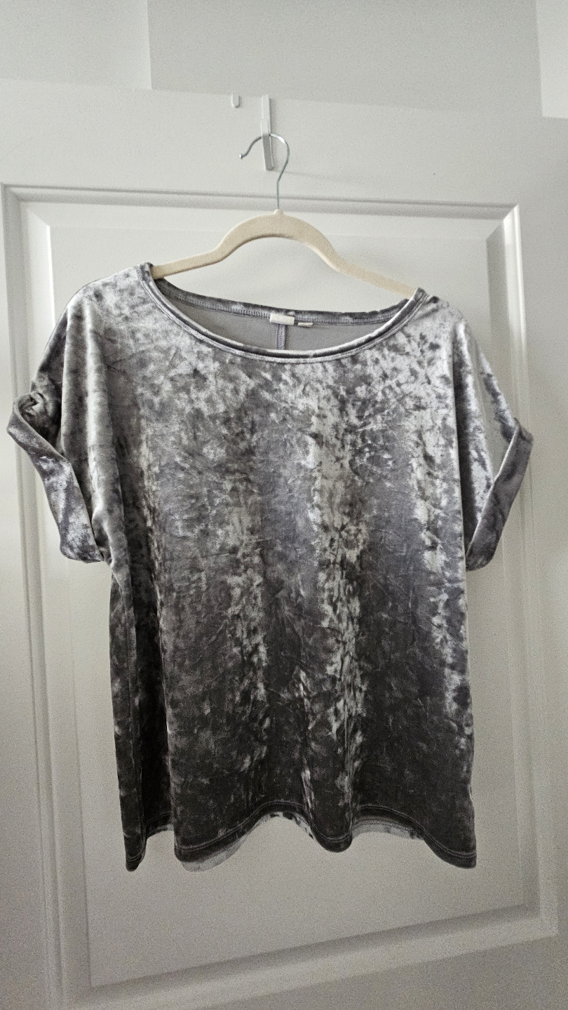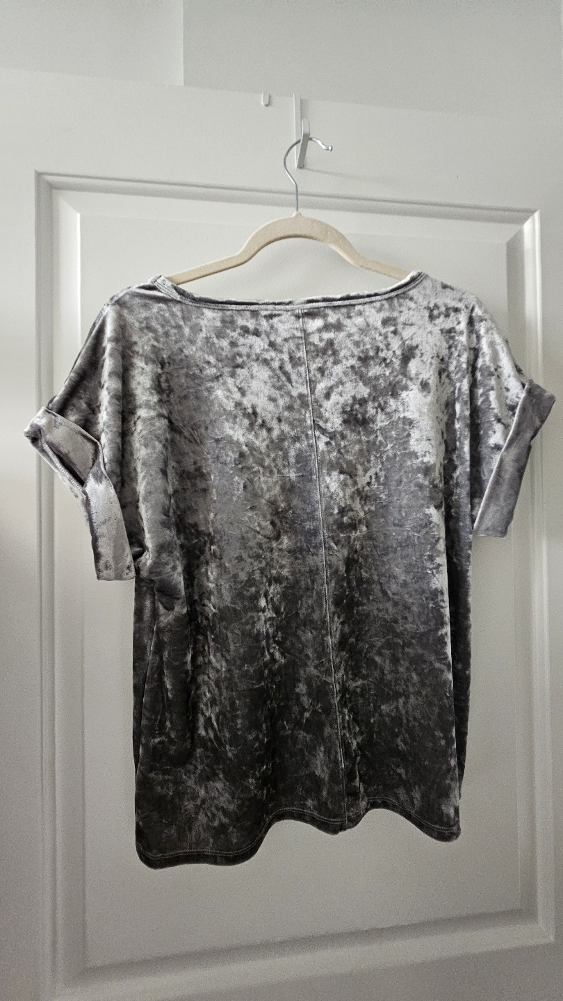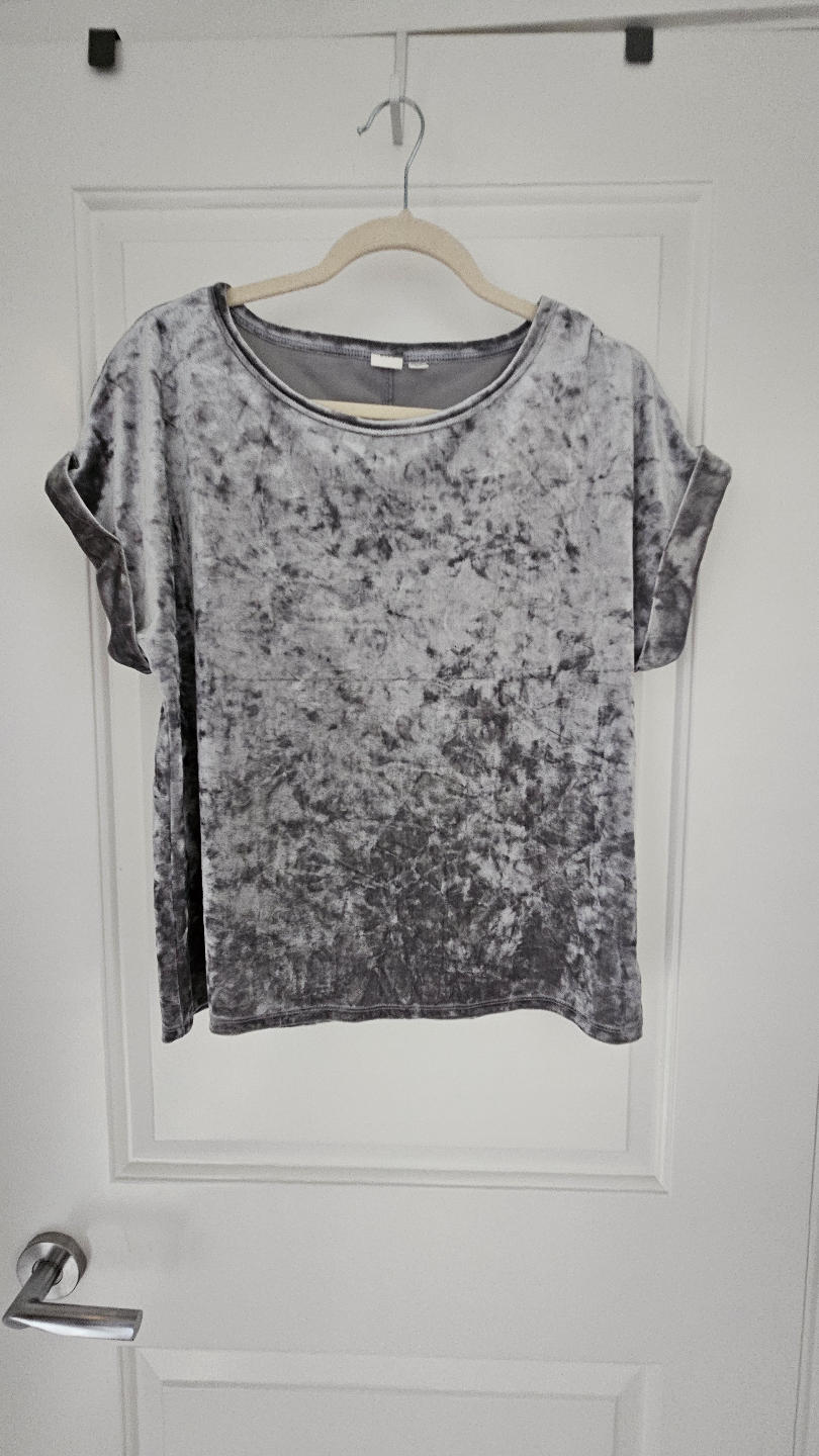 Grey-toned crushed velvet top. Size Medium. Short sleeves with rolled cuffs. A fantastic piece for any wardrobe, perfect for a night out or casual day.