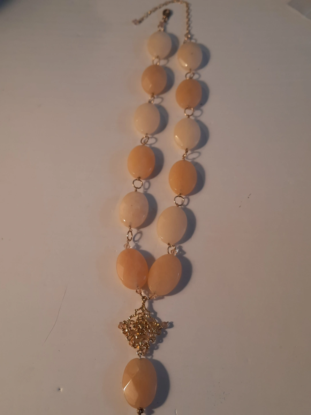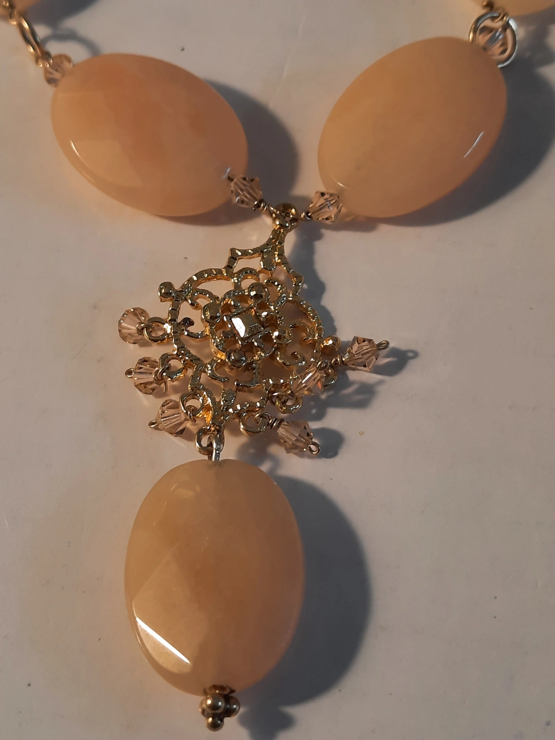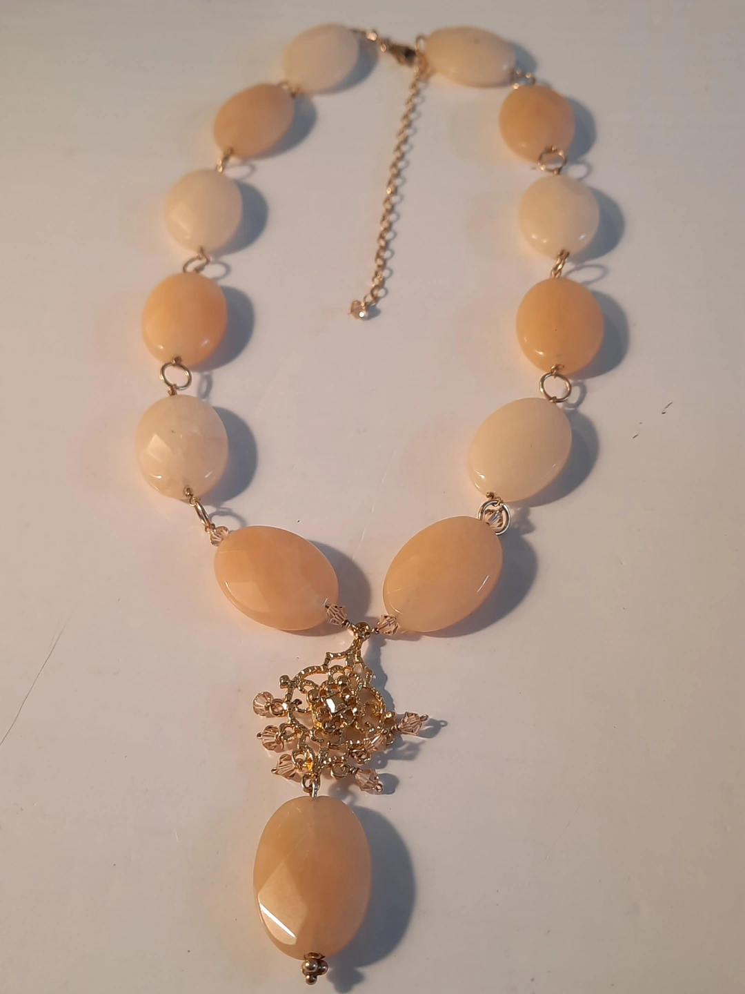 Necklace with large oval stones and a decorative central drop. The necklace is fastened by a chain.14k gold over silver 925. The centrepiece has a star-like filigree design, with smaller faceted stones attached. You could enjoy it by wearing it with a neutral outfit.