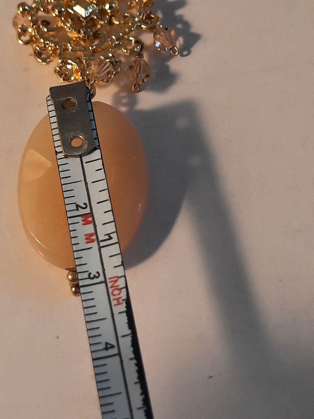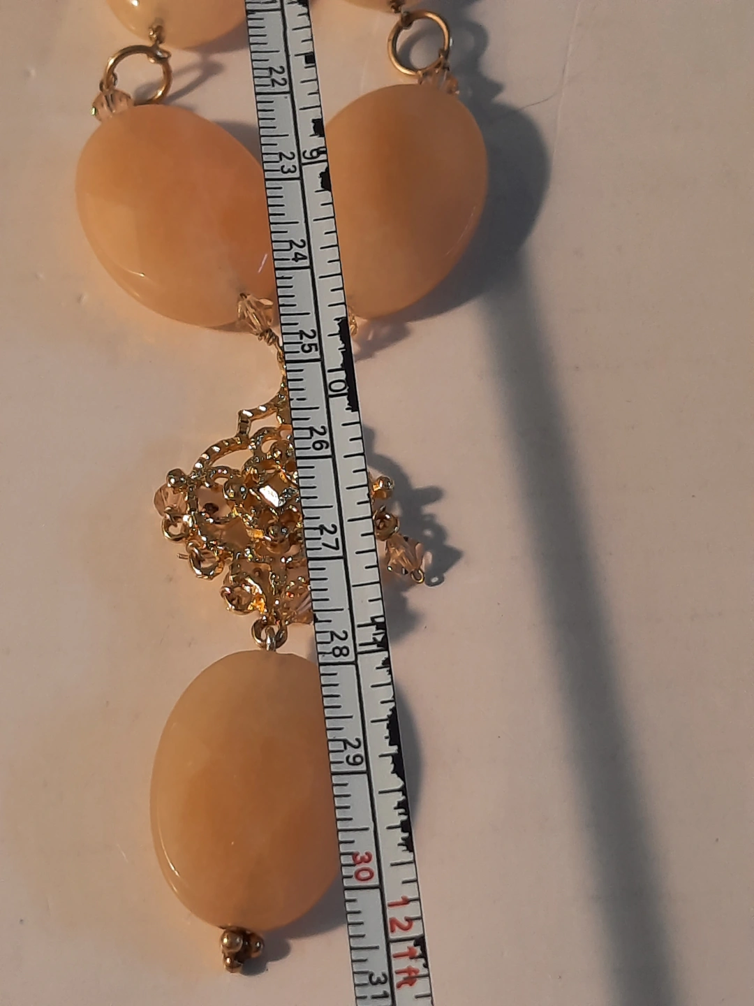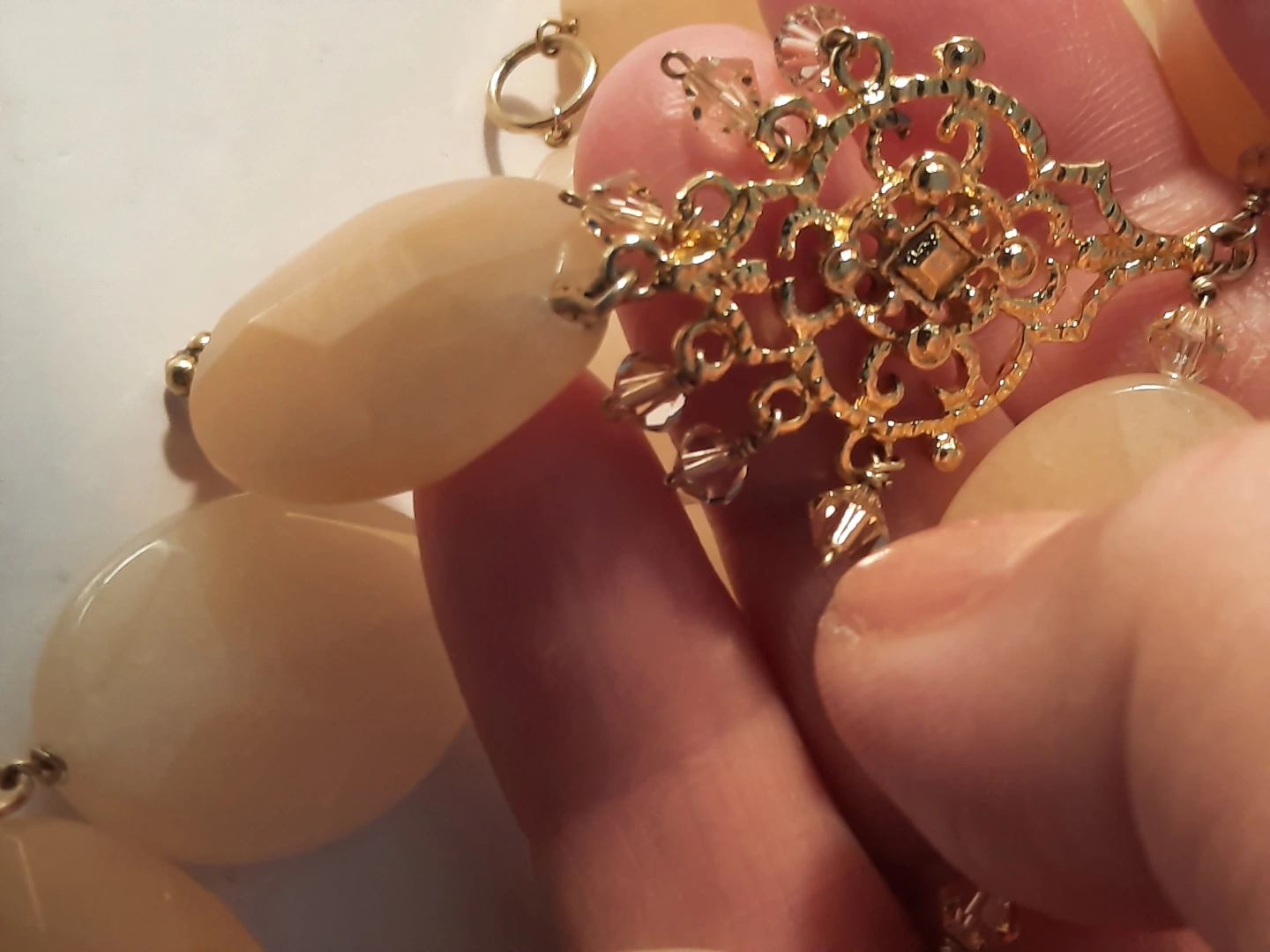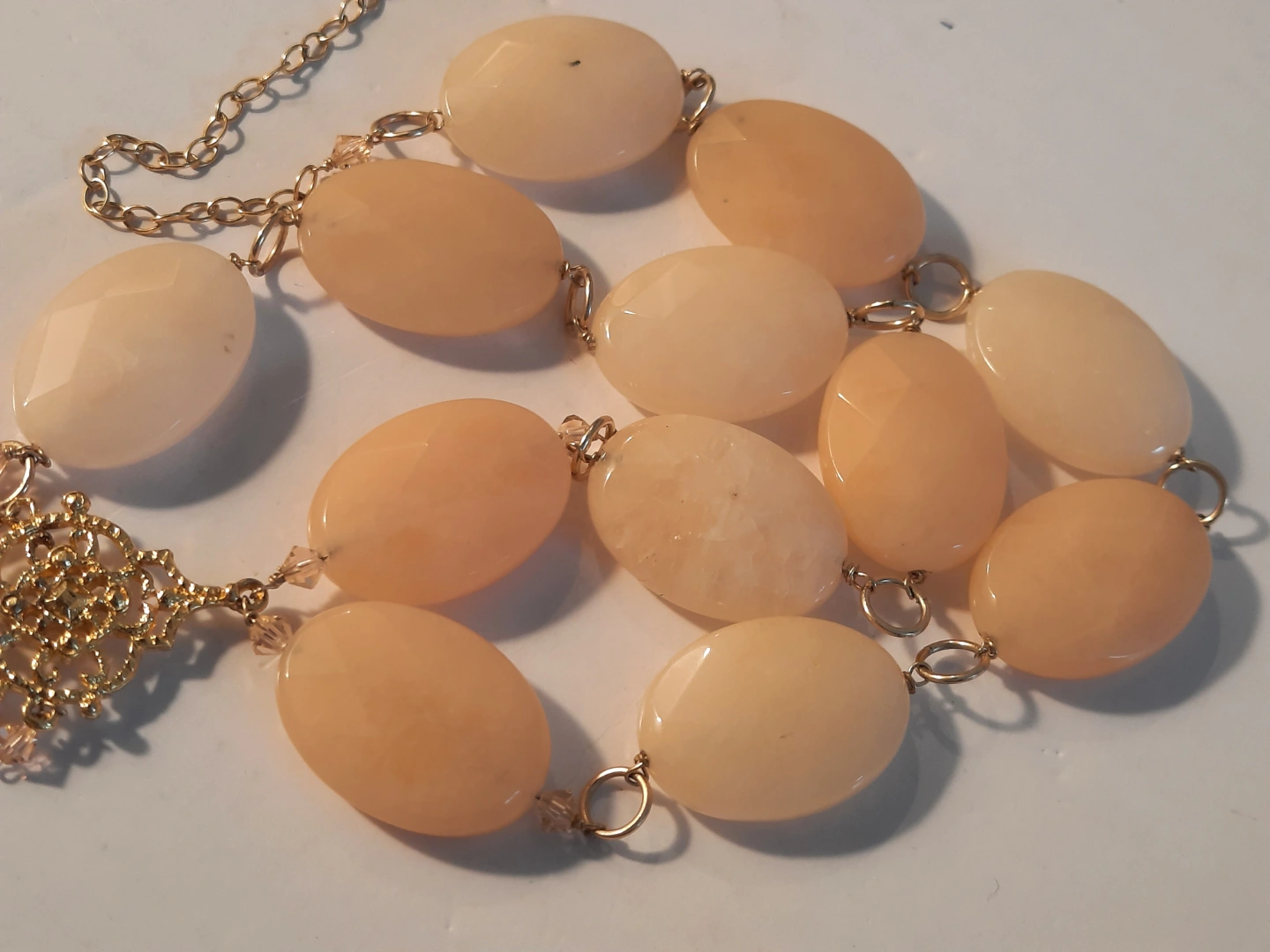 Necklace with large oval stones and a decorative central drop. The necklace is fastened by a chain.14k gold over silver 925. The centrepiece has a star-like filigree design, with smaller faceted stones attached. You could enjoy it by wearing it with a neutral outfit.