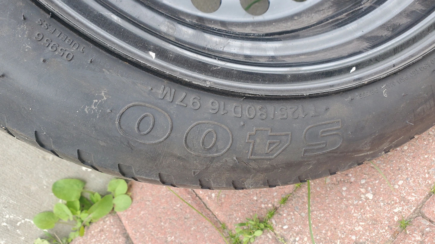 A spare tire, with a black wheel. A great item to have on hand for emergencies, so you can get back on the road calmly.