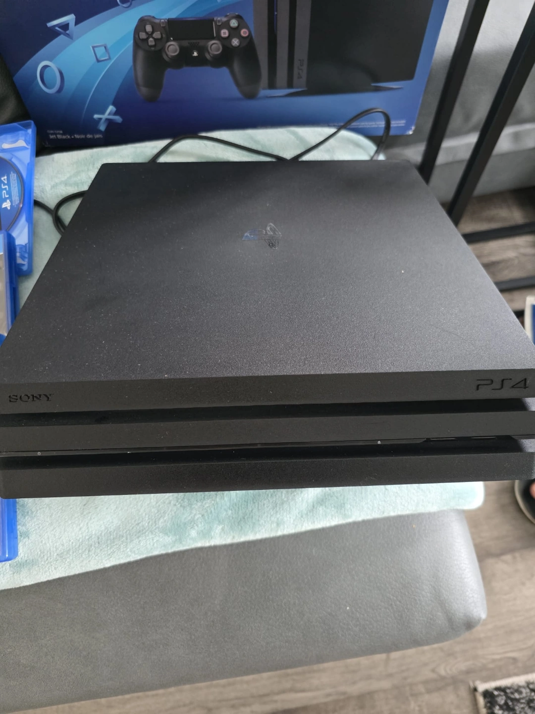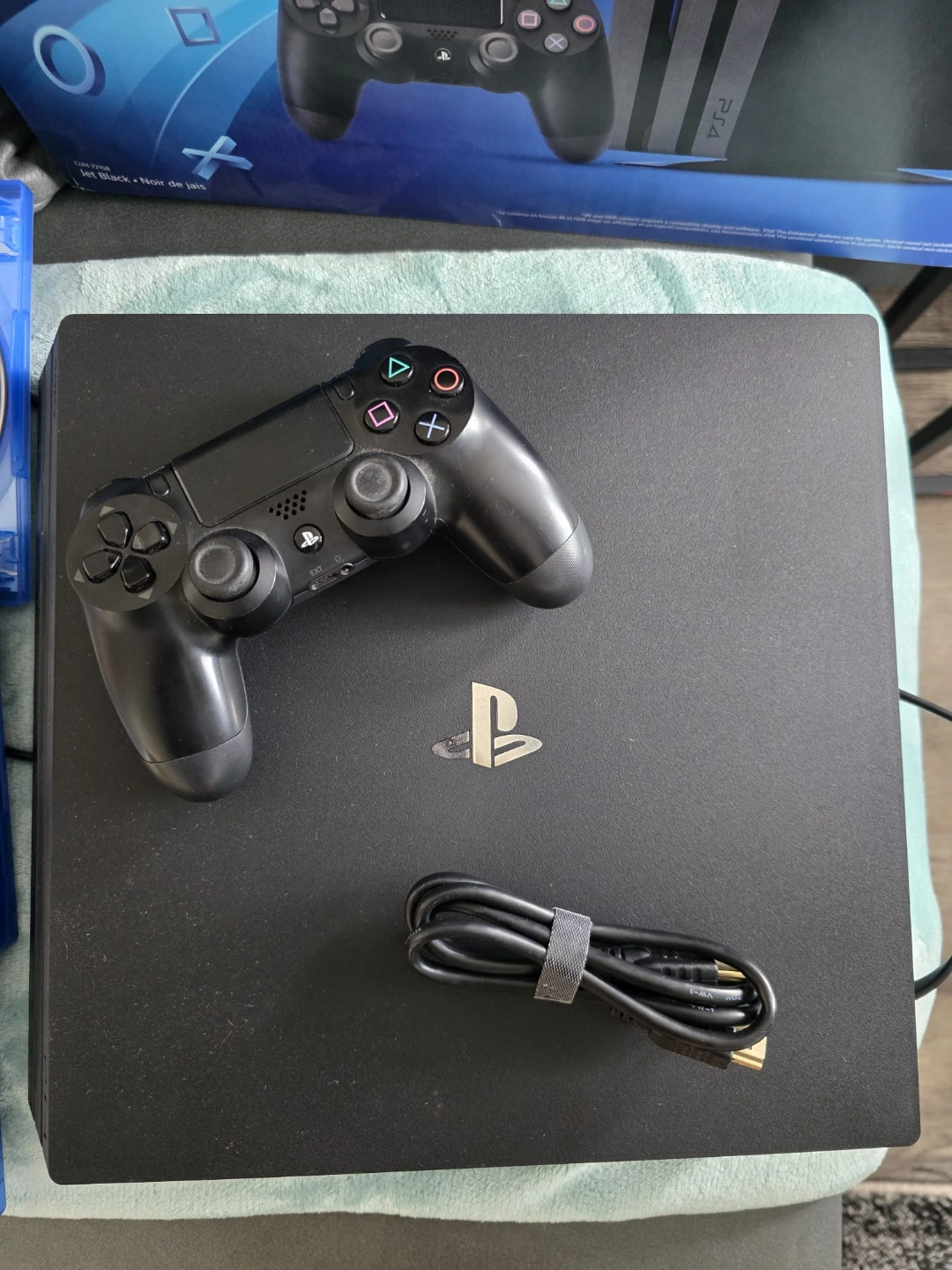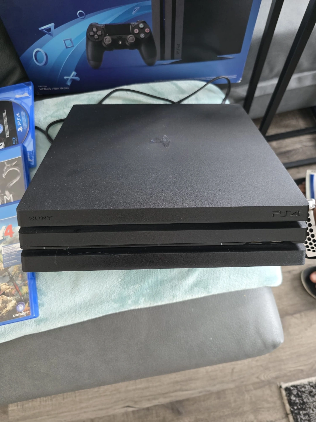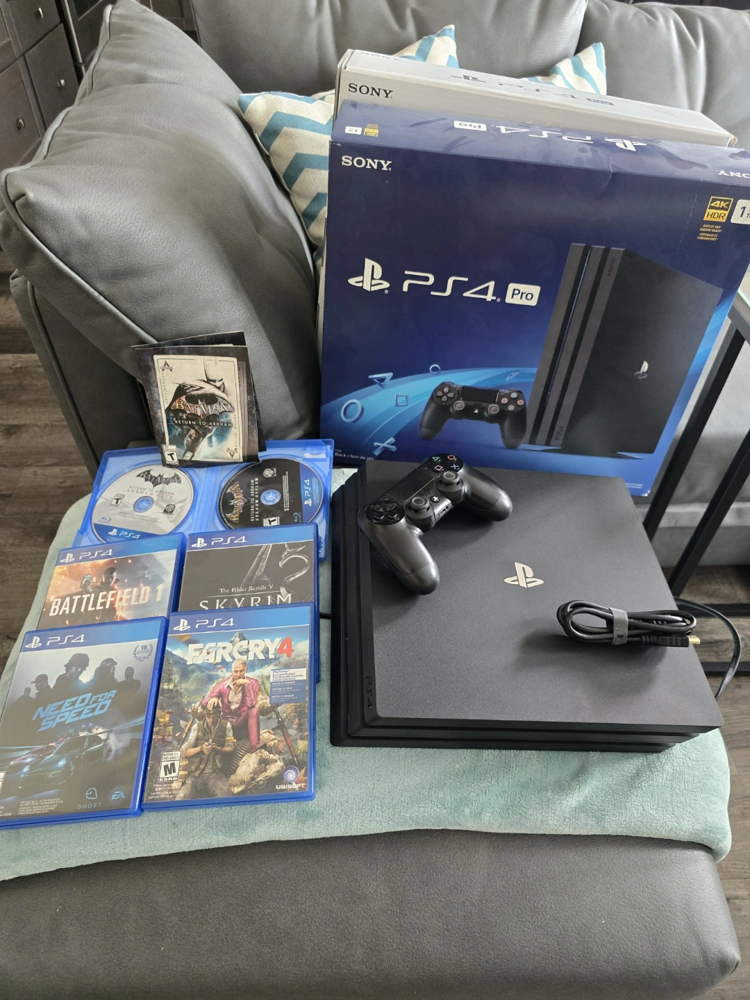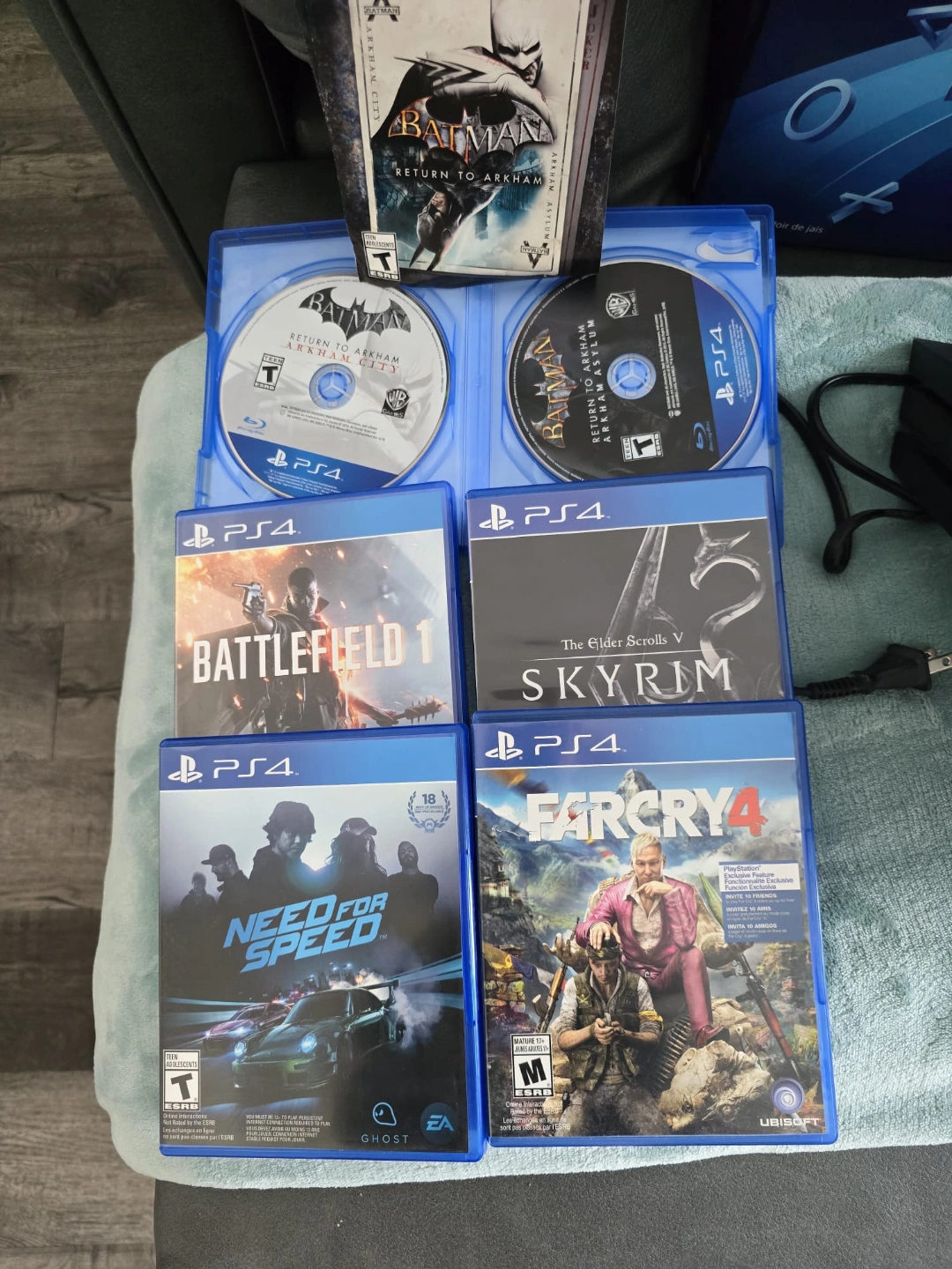 PS4 including 2 controllers & 6 games. Games included: Batman Return to Arkham Skyrim Battlefield 1 Need For Speed Far Cry 4 Everything included is in great condition. PS4 and games in original packaging.