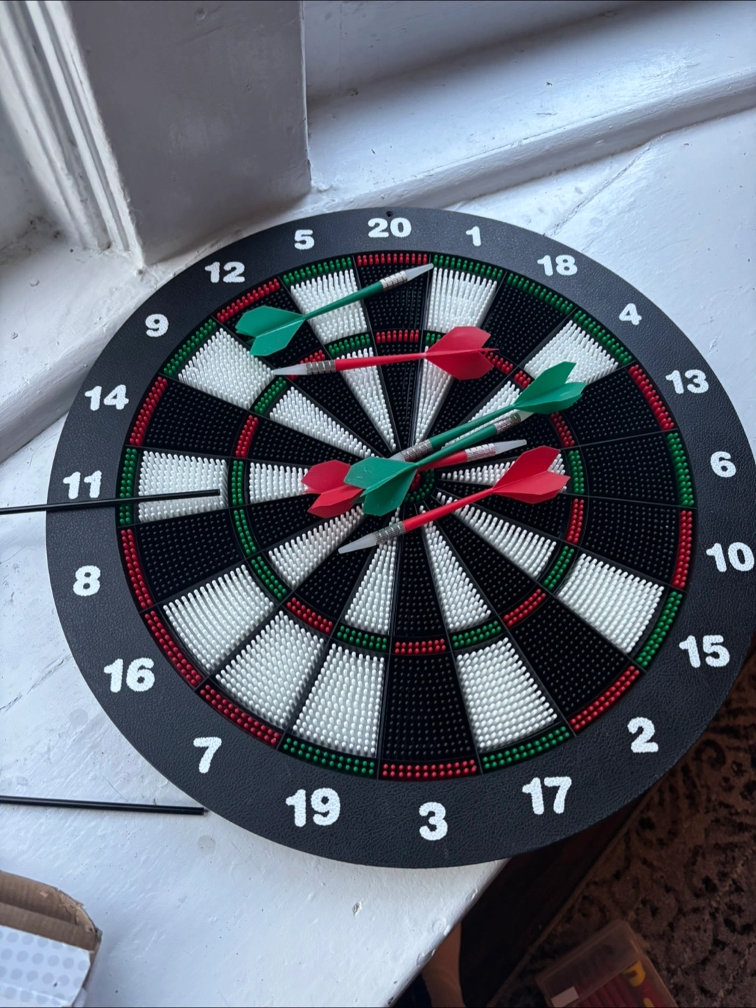 Dartboard with darts included. The board has a black and white design with numbers around the edge. Comes with red and green darts. This set is perfect for unwinding and relaxing with a fun game.