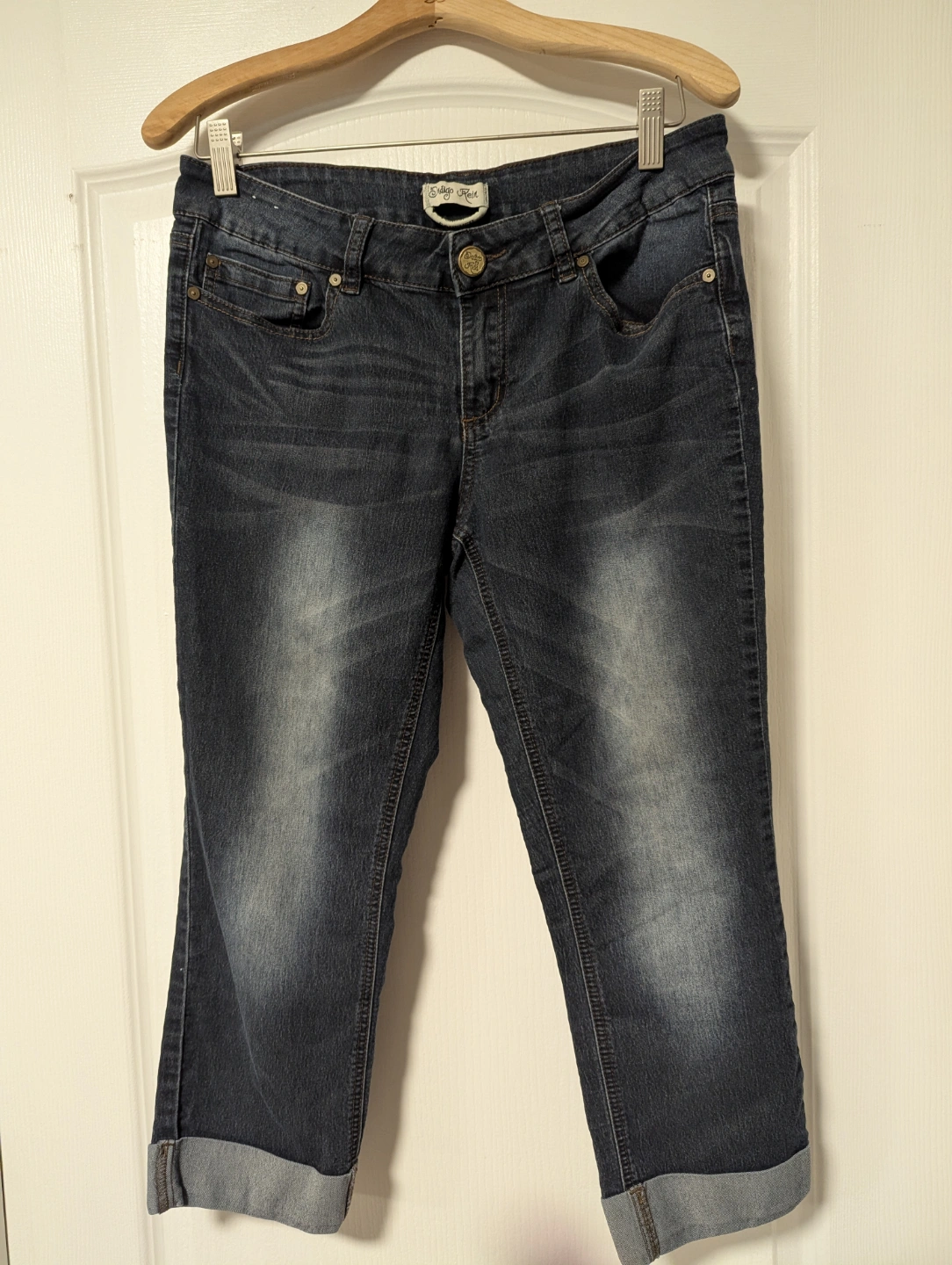 Dark wash denim jeans. Cropped length with rolled cuffs. Button and zipper closure. Two front pockets and two back pockets. Back pockets feature decorative stitching. Find serenity and comfort by wearing these jeans on a casual day.