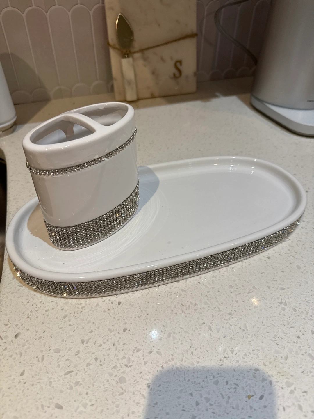 White ceramic toothbrush holder. Accompanied by an oval tray. Both pieces are adorned with rhinestone detailing. A beautiful addition to any bathroom, creating a relaxing spa atmosphere.