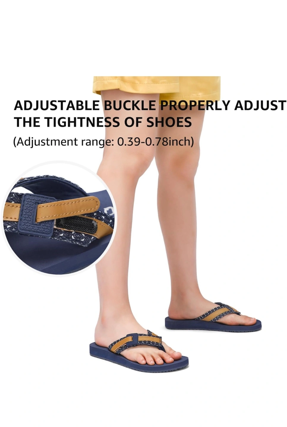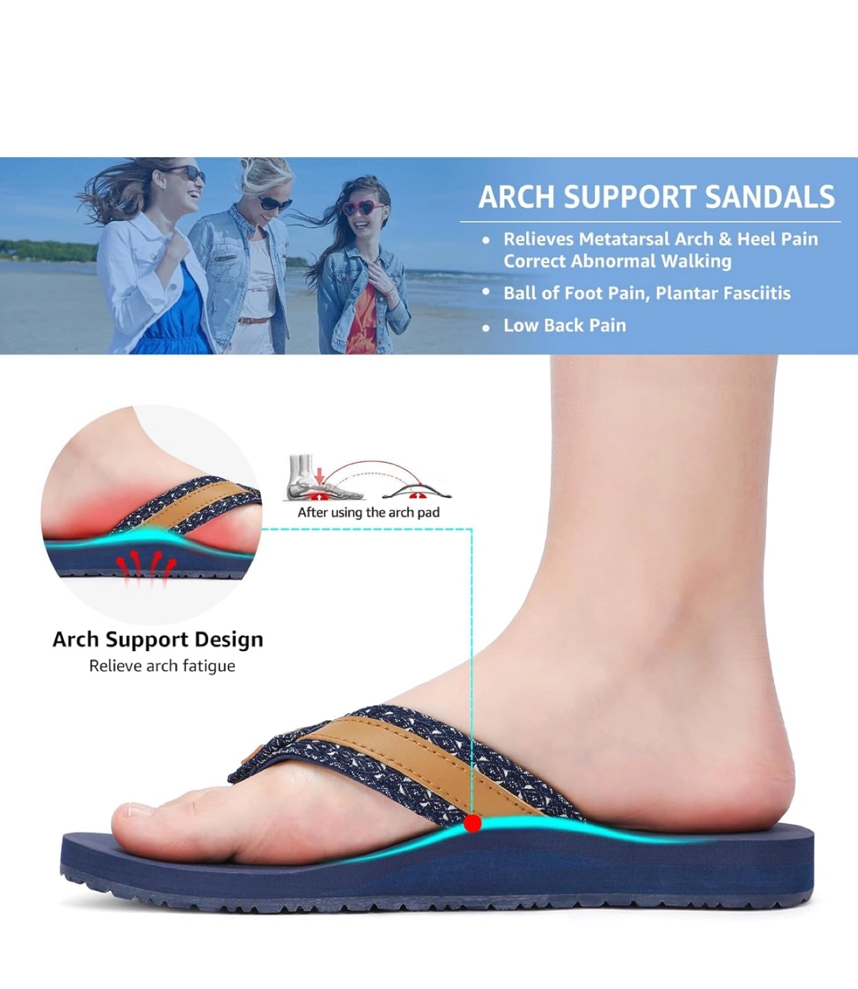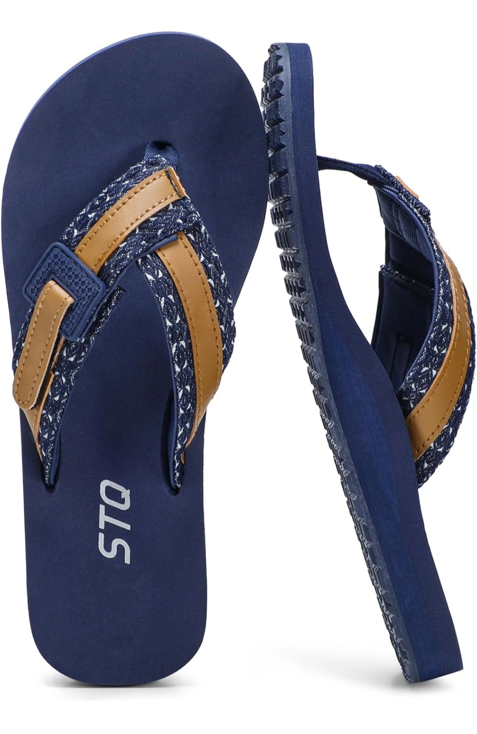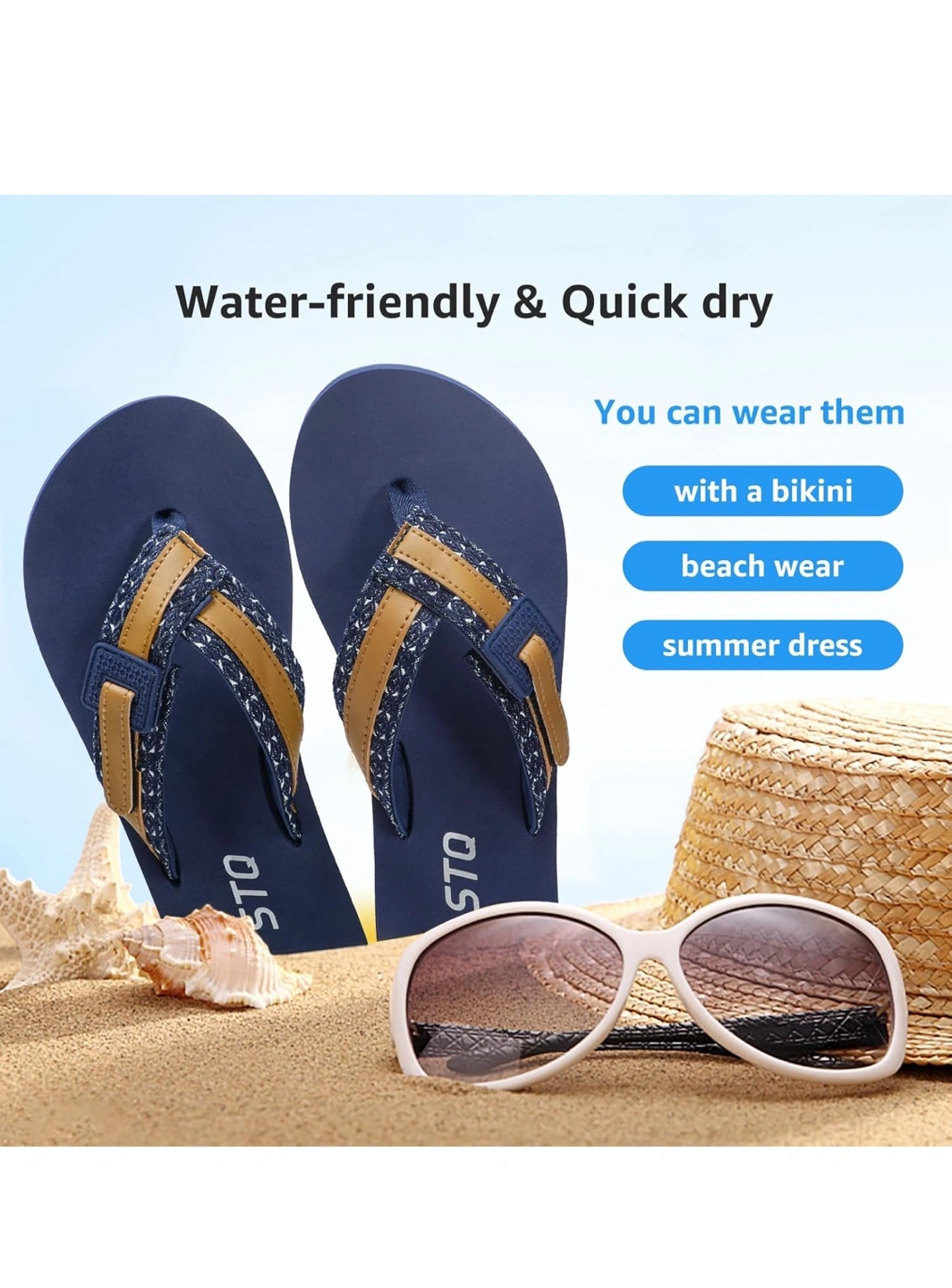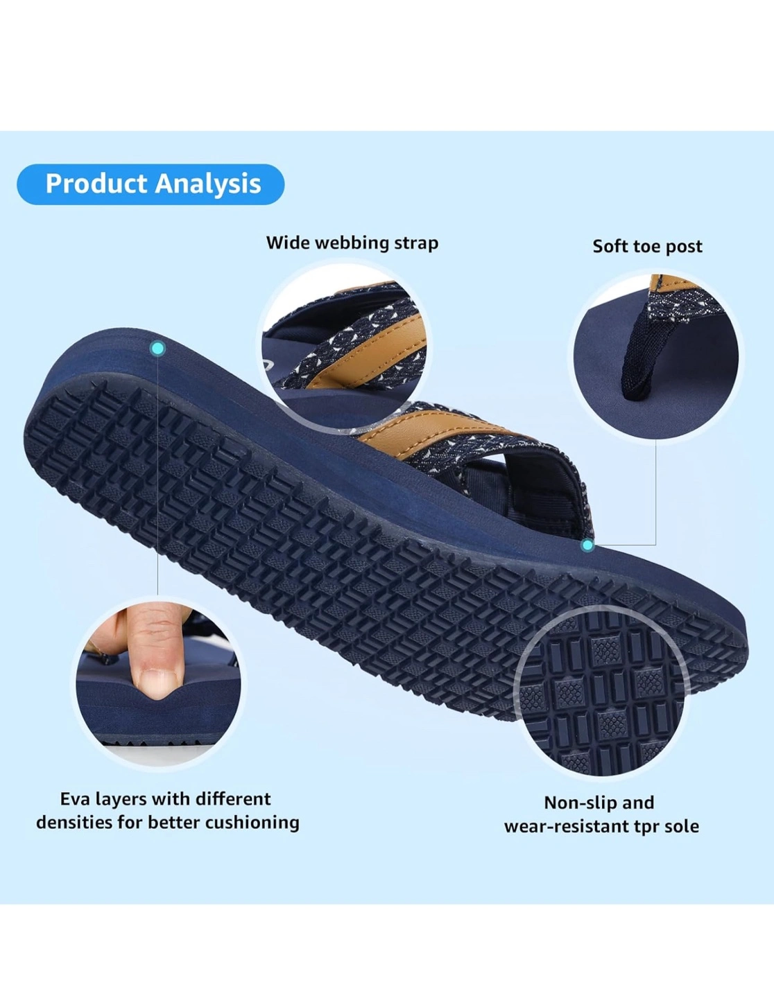Blue flip-flops. Feature wide webbing straps and a soft toe post. They are designed for comfort and support. These flip-flops would be perfect for a relaxing day at the beach.