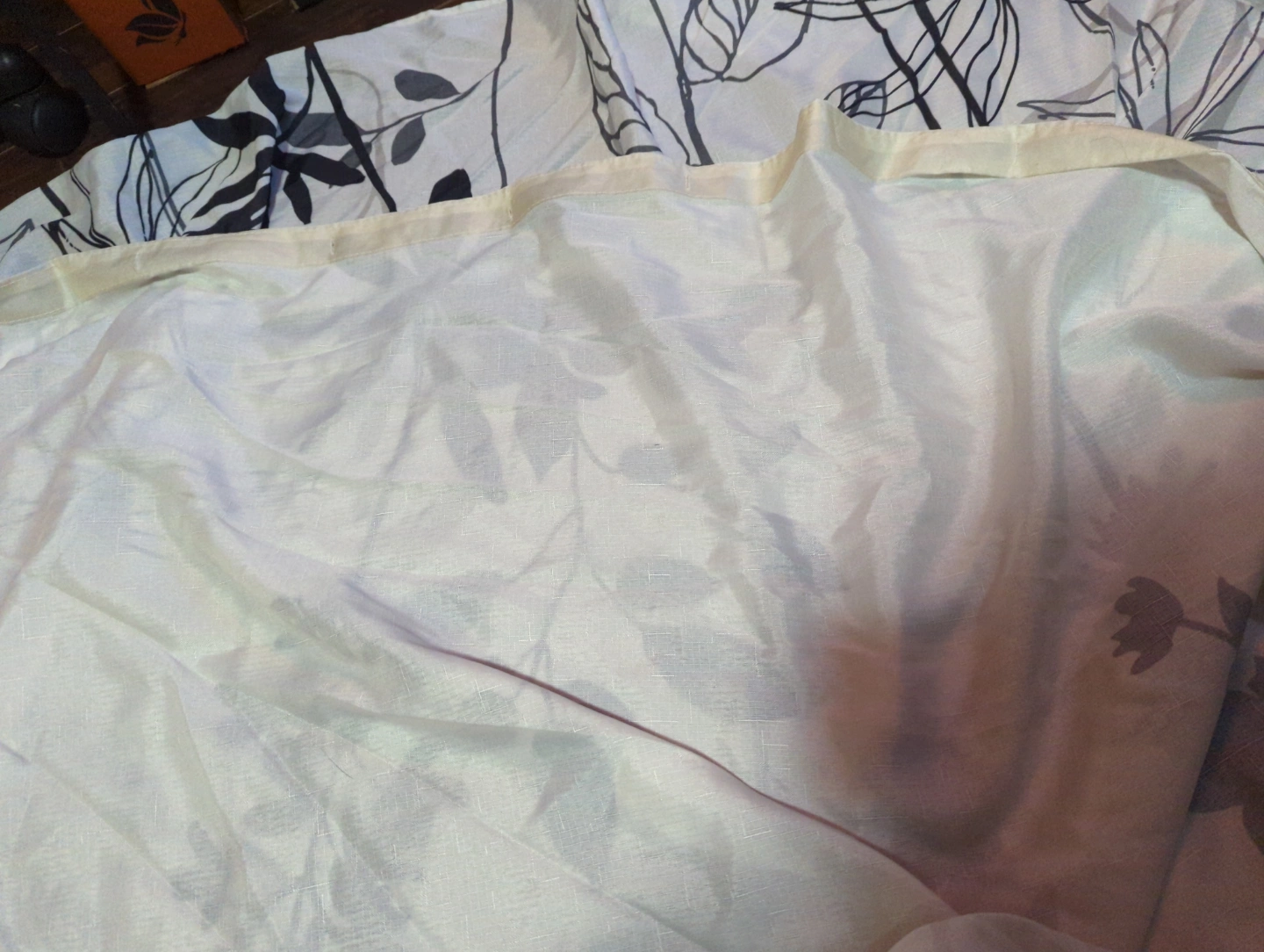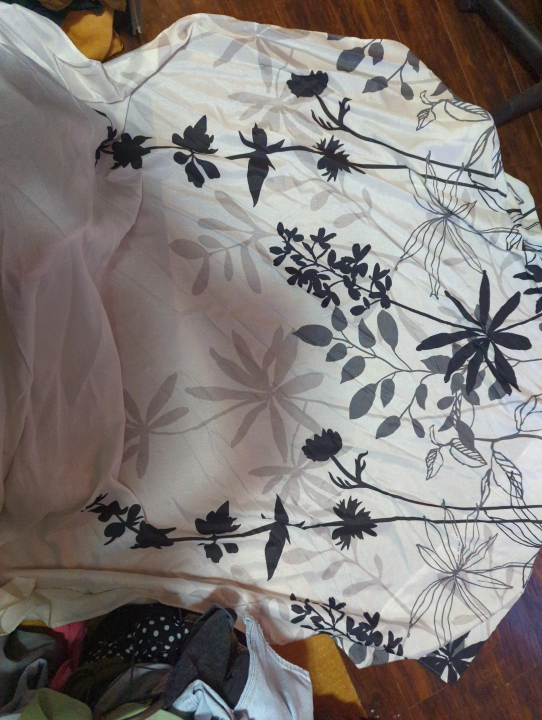 A white shower curtain. Decorated with a floral pattern in black and grey. The inside is a plain, light-colored material.