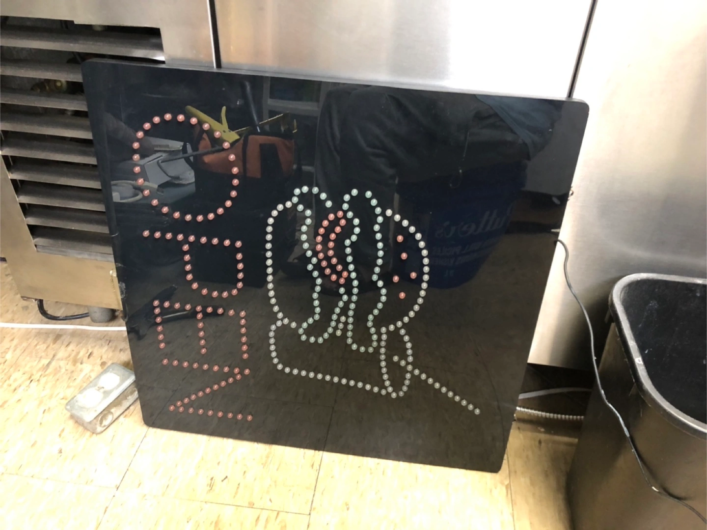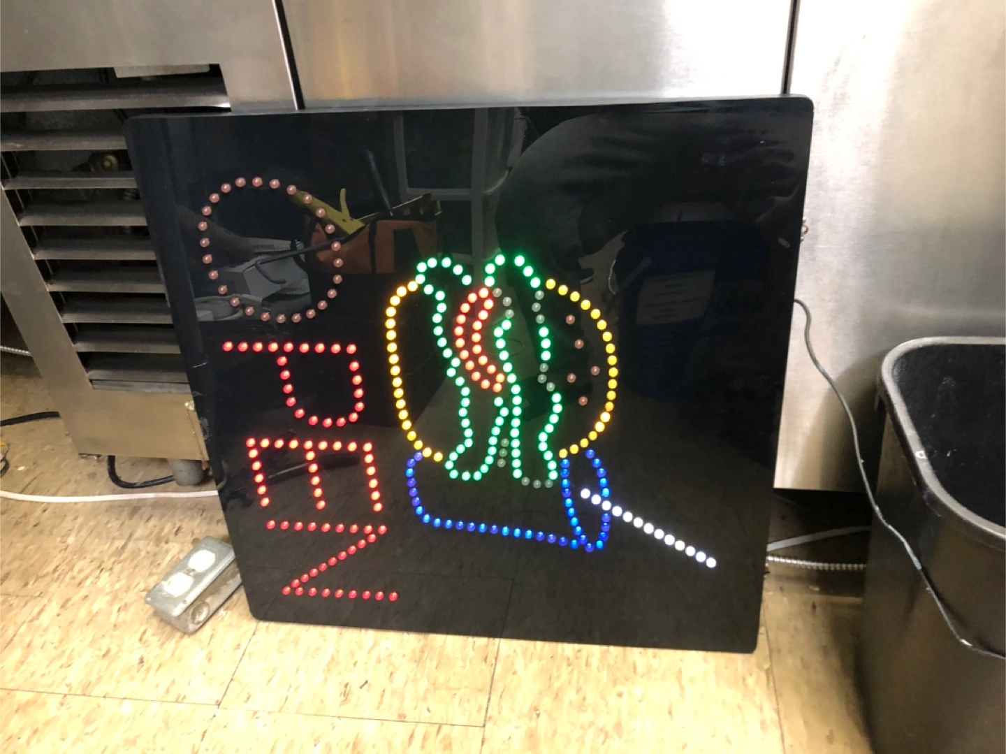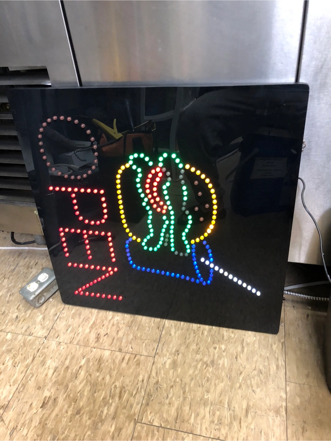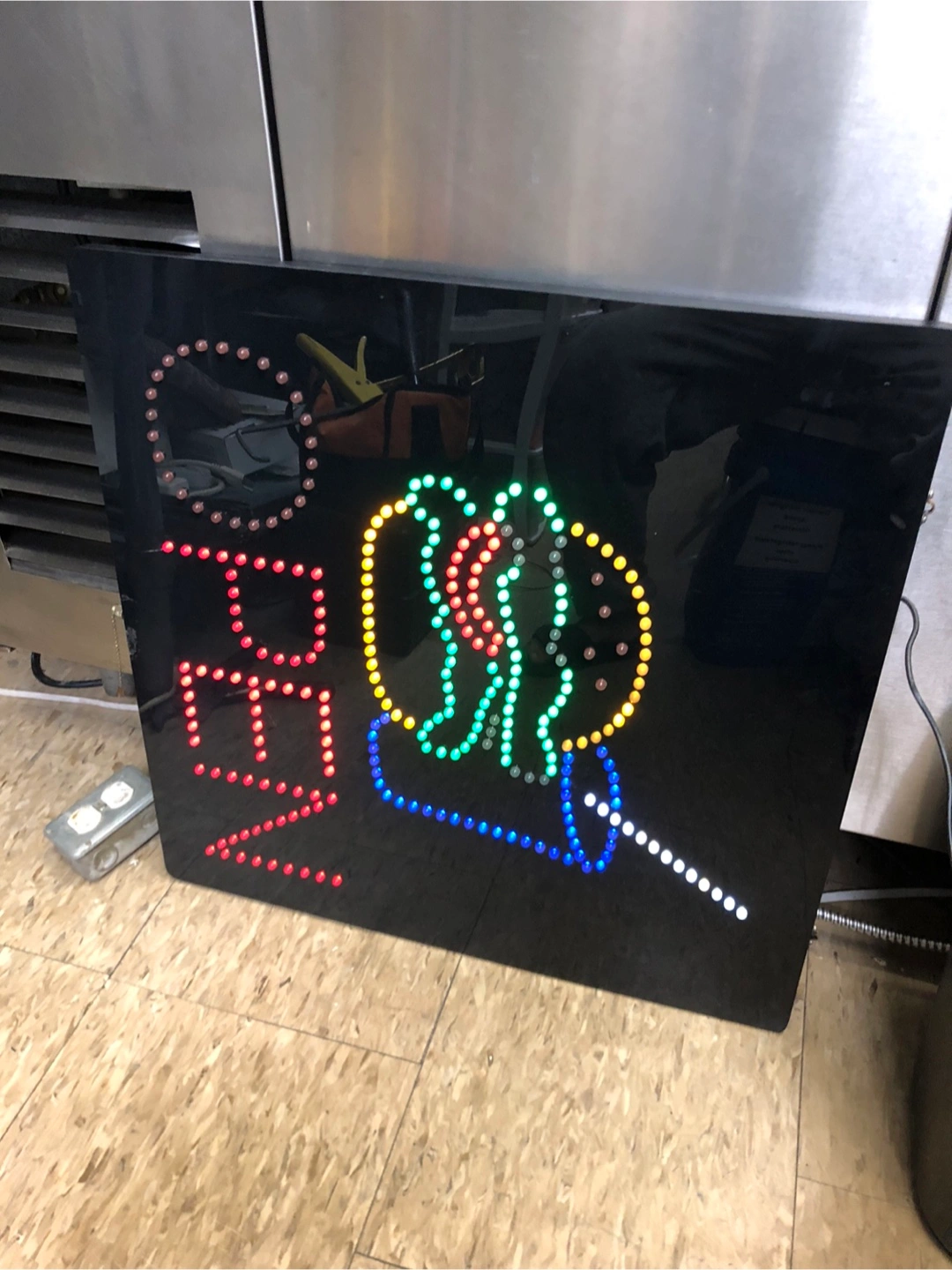 78LED sign, with the word 'OPEN' with burger and juice lit up in red. Also displays a colourful image. A lovely addition to any business.