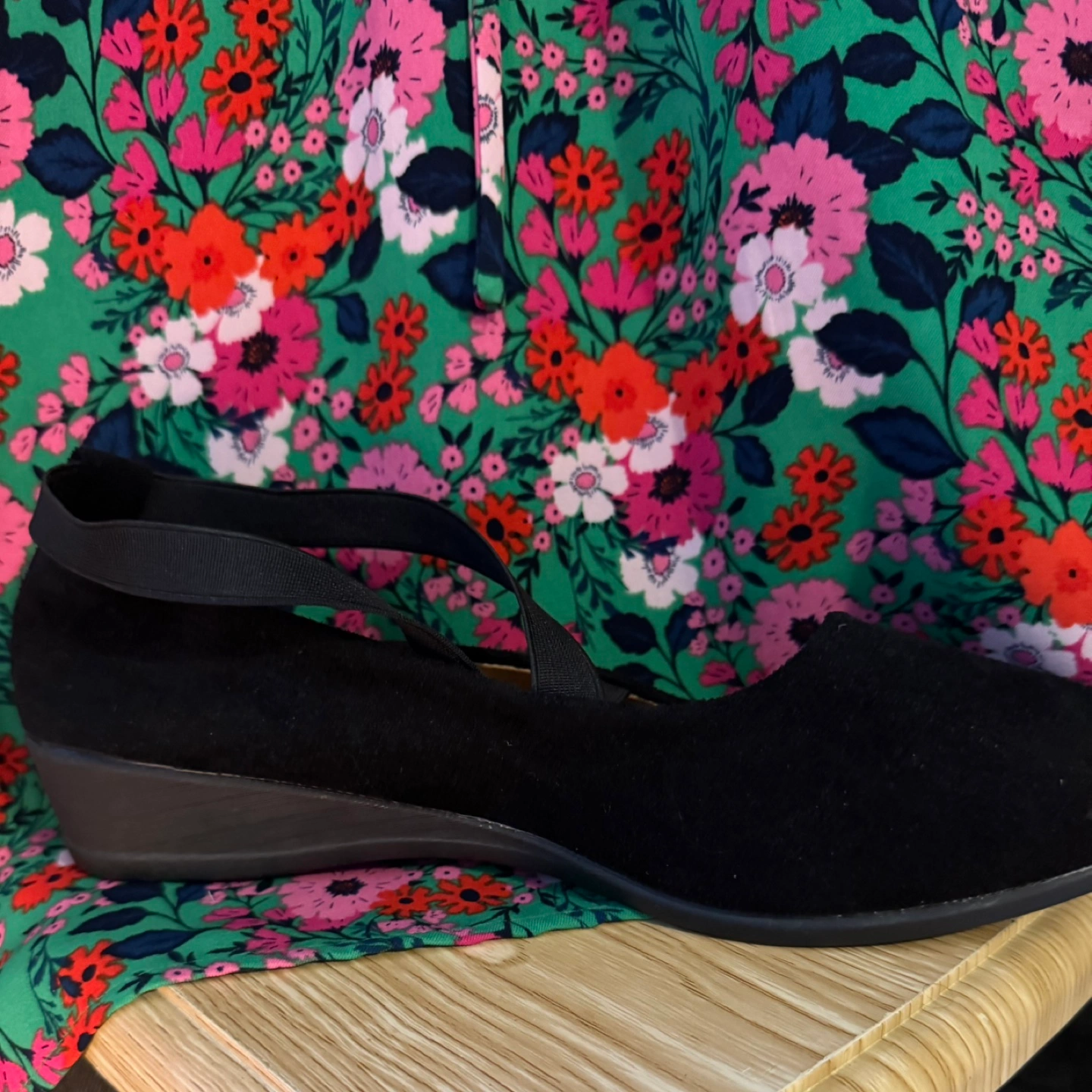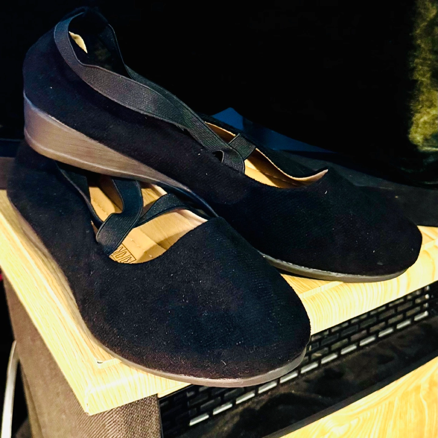 Black flats. Suede exterior. Elastic straps across the top. They would be lovely to wear while strolling through a park. Straps rise to encircle the ankle. Run slightly large.- like an 8.5. New without tags. Never worn.
