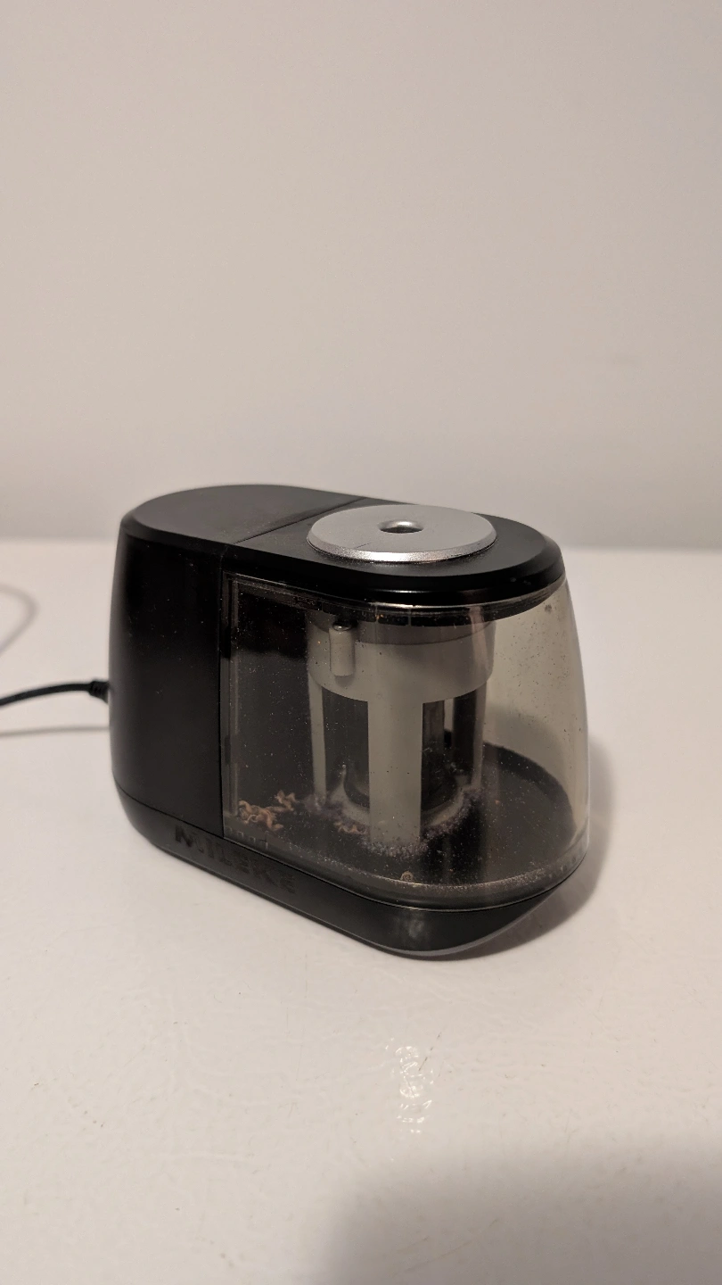 Electric pencil sharpener, in black. Clear compartment for shavings. Silver top. Can be a great tool to take the stress out of a busy day.
