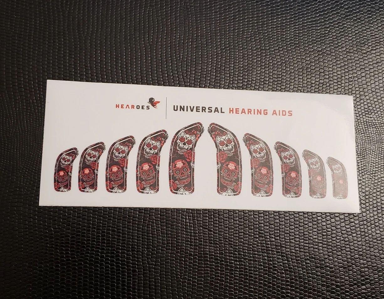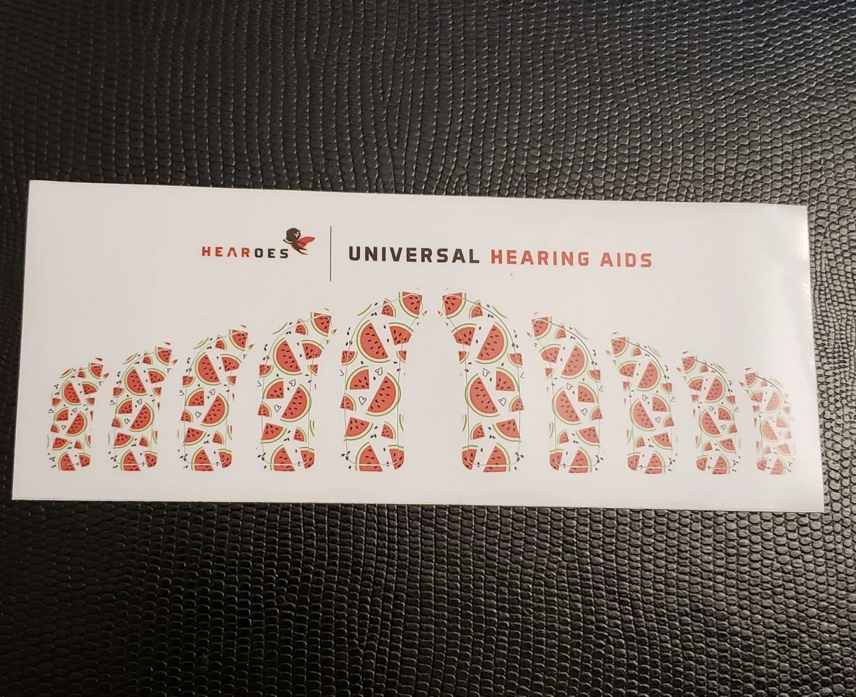 Free hearing aid stickers. Decorate your heading aids. Got a watermelon theme and the other one is called Day of the Dead.