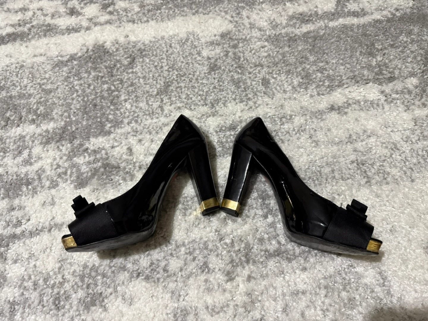 High-heeled shoes. Features a peep-toe design and block heel. These shoes are perfect to wear for any special occasion, providing a sense of elegance.