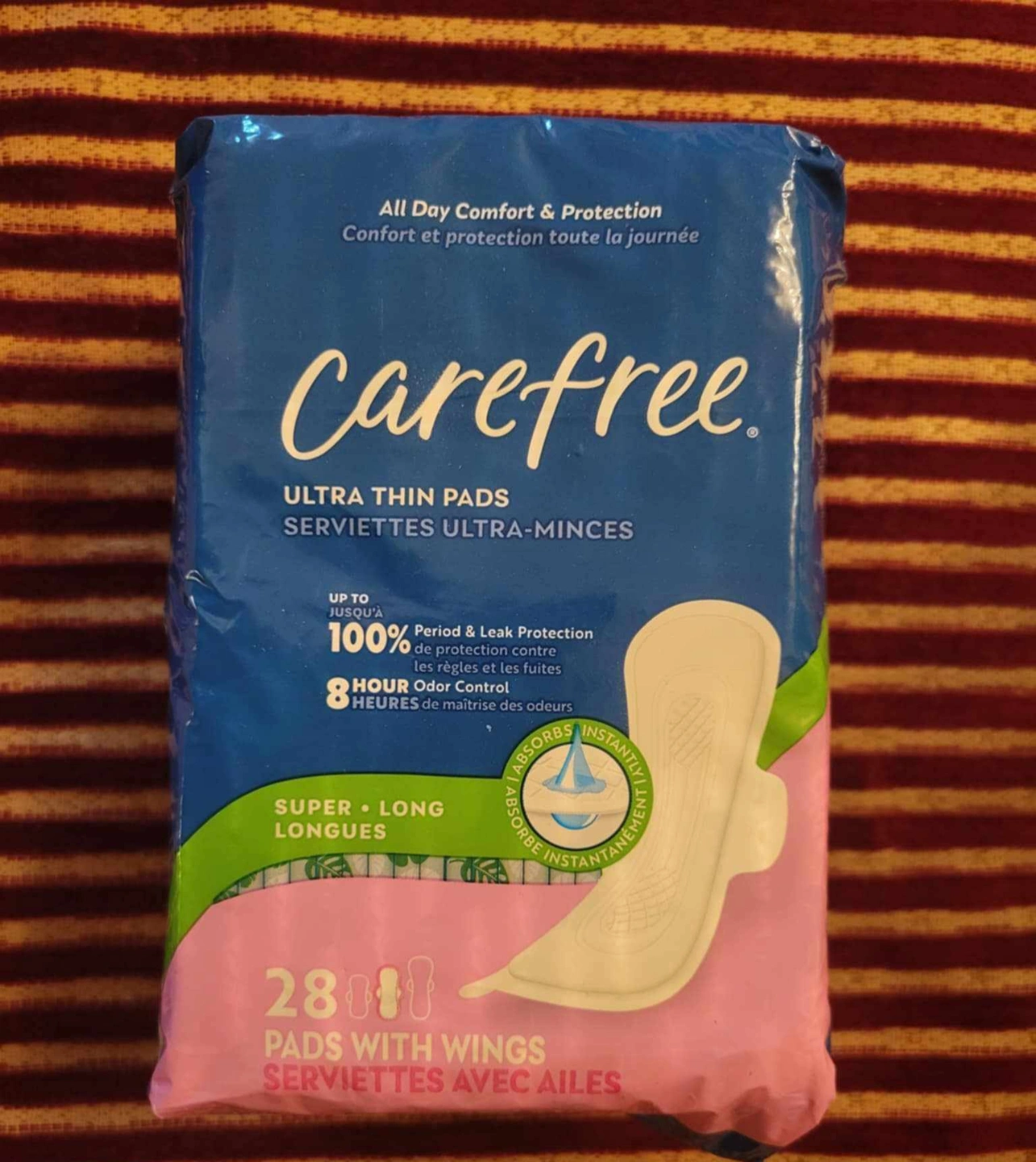 A package of pads with wings. The package is in a blue and pink colour scheme. You can experience a sense of security knowing you are well protected during your cycle. Multiple available