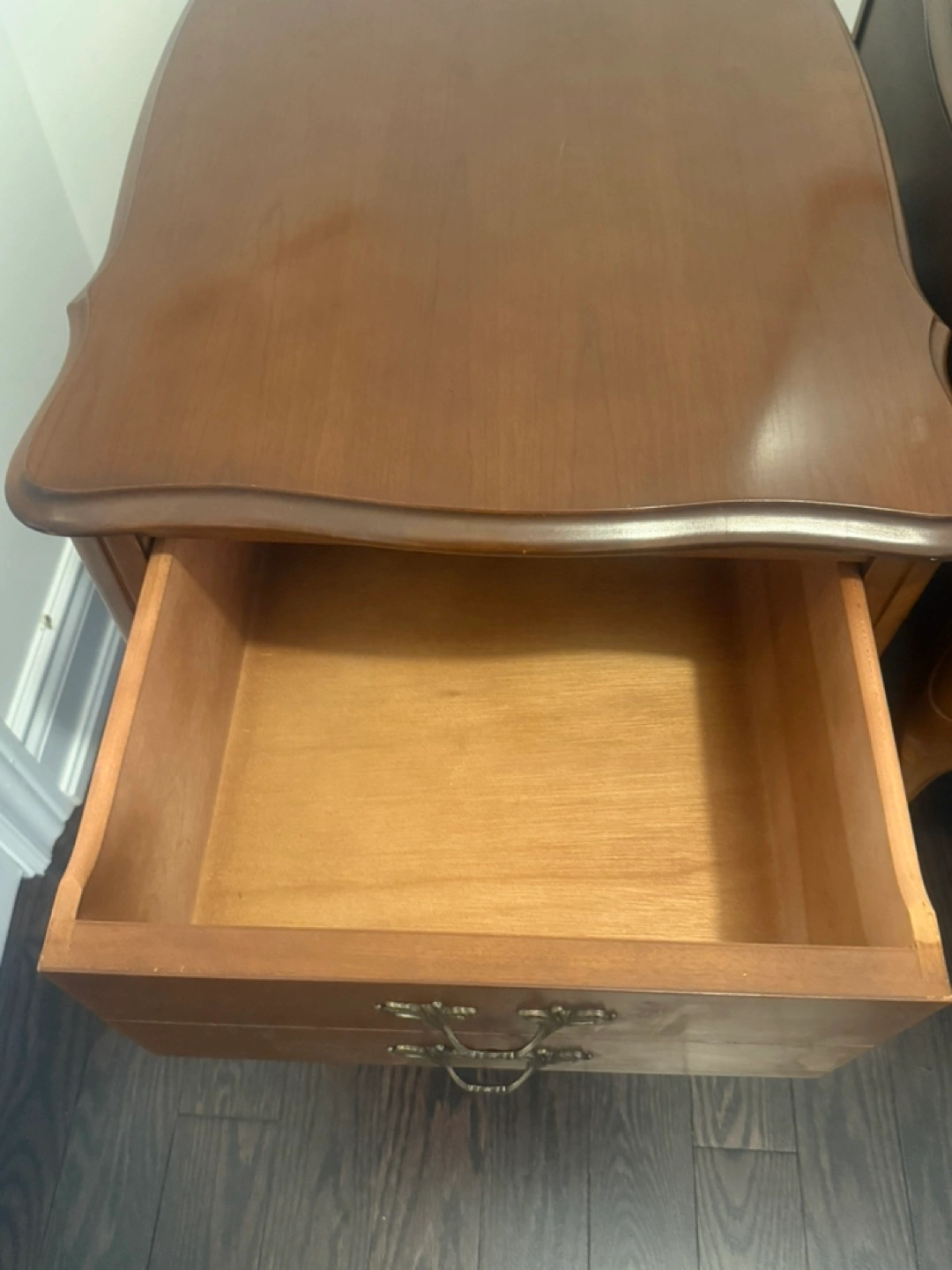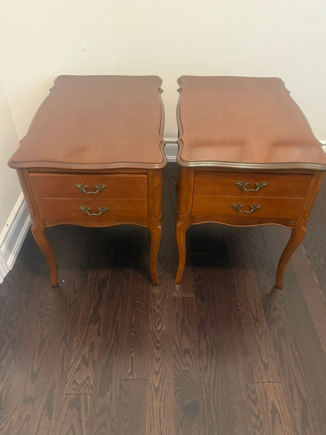 Pair of two French Provincial Walnut Matching nightstands. Each has two drawers and decorative handles. Scalloped edges on the table tops. Legs are curved. These nightstands provide a perfect space for resting after a long day.