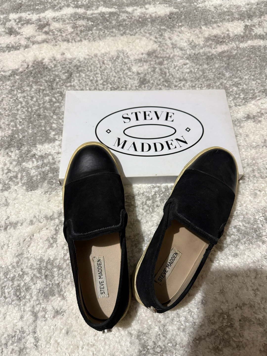 Black slip-on shoes. Soft, likely leather upper. White soles. These shoes would be a lovely addition to your casual wardrobe.