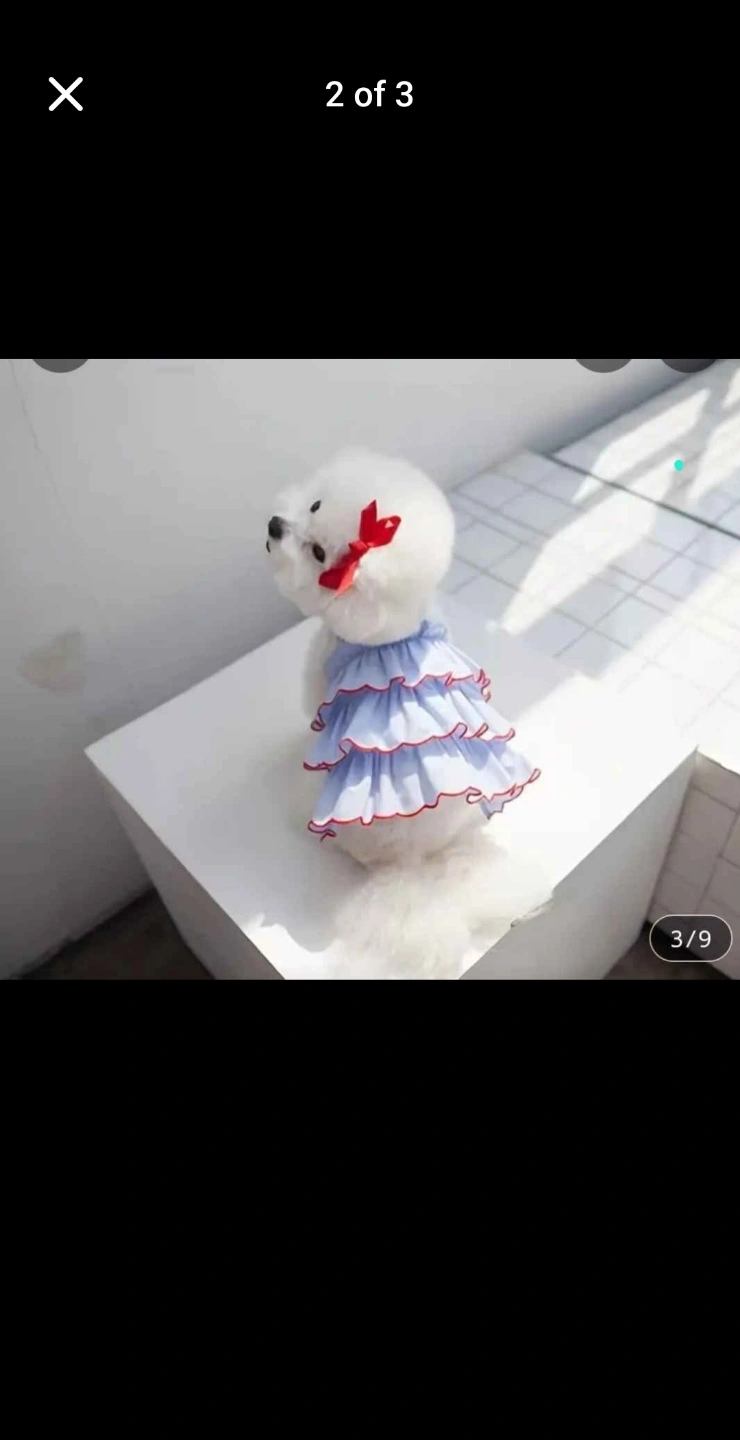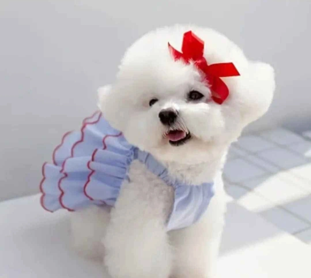 Dog dress with a red trimmed edge. Has several layers of ruffles.